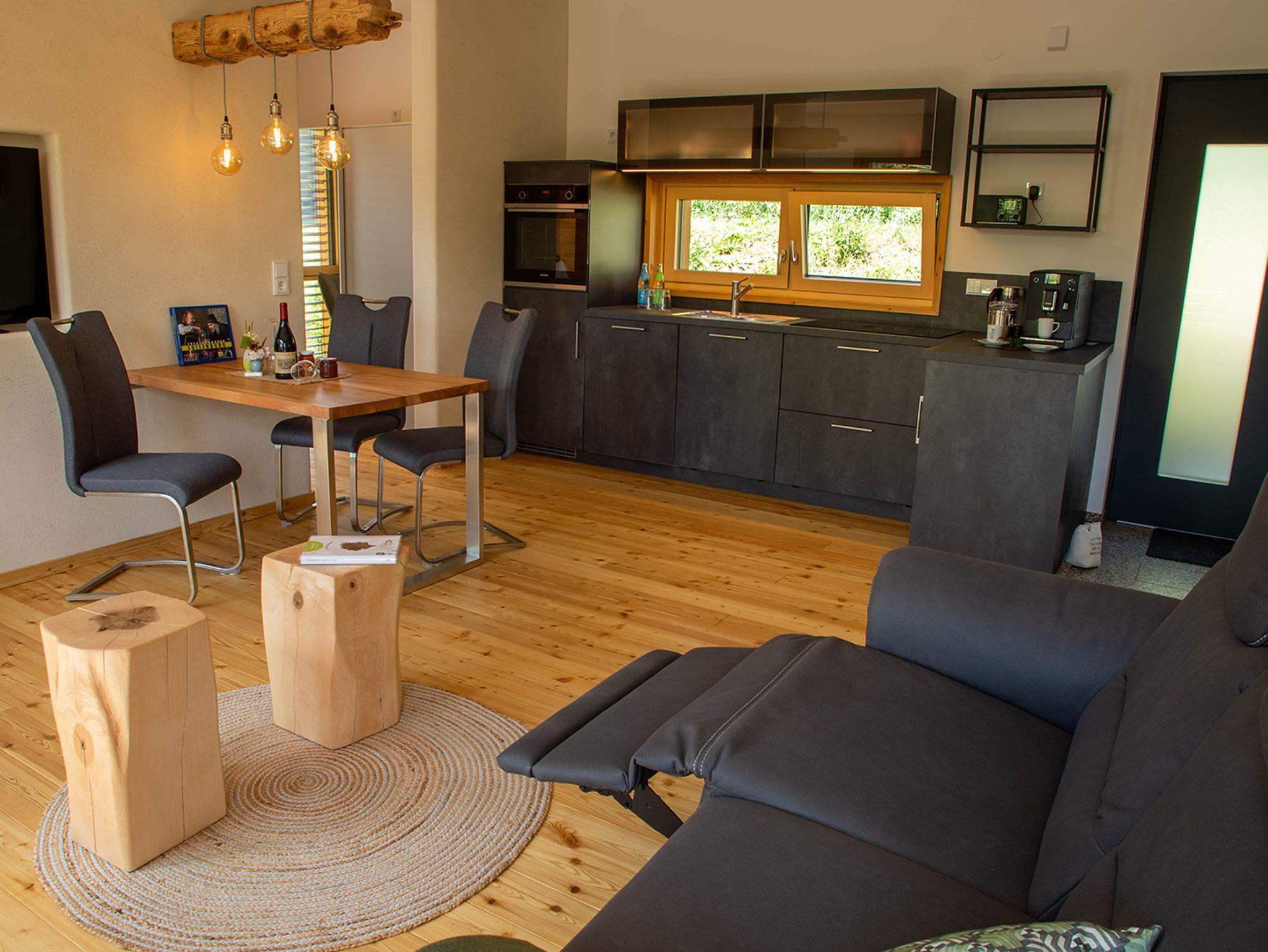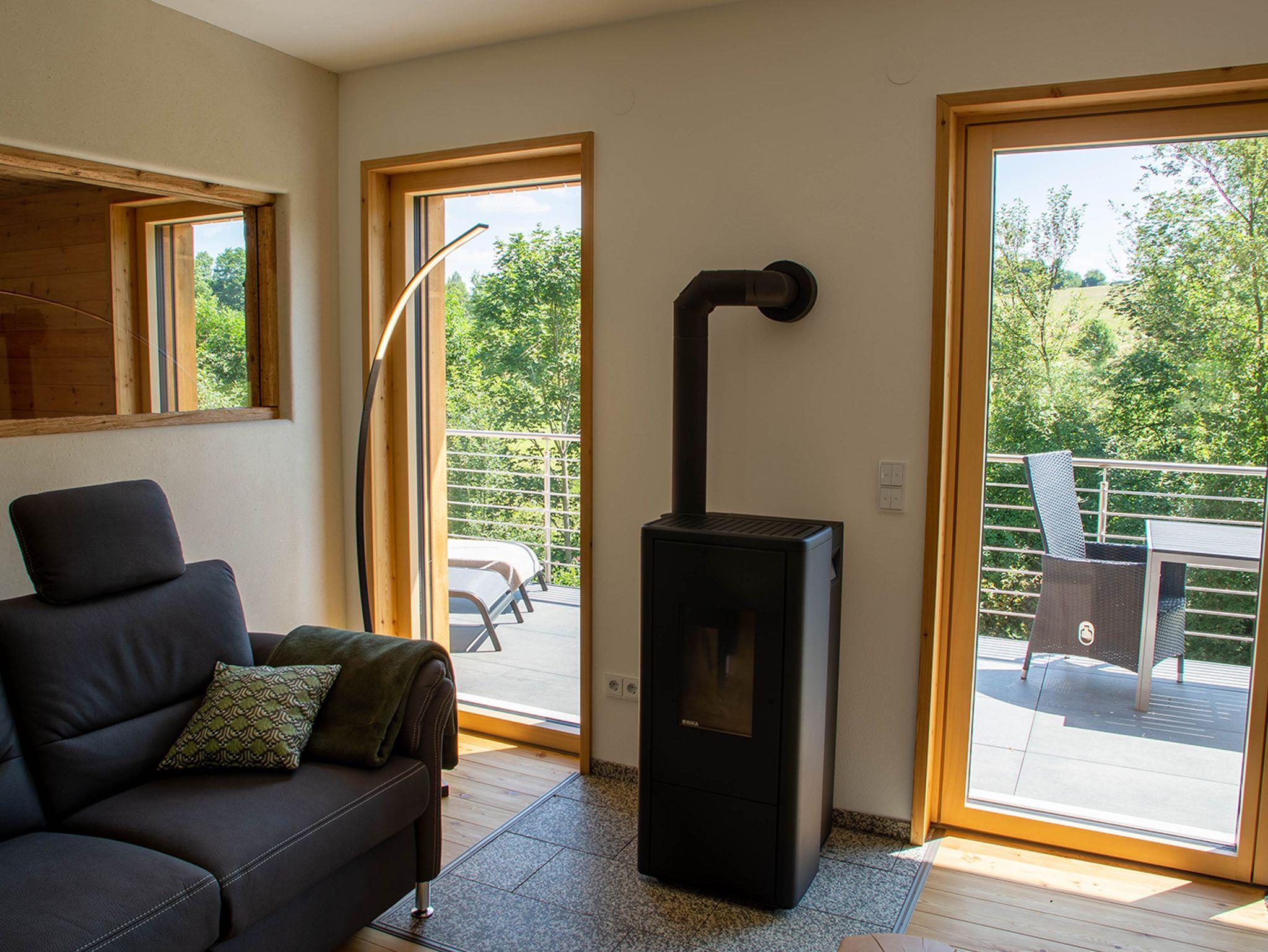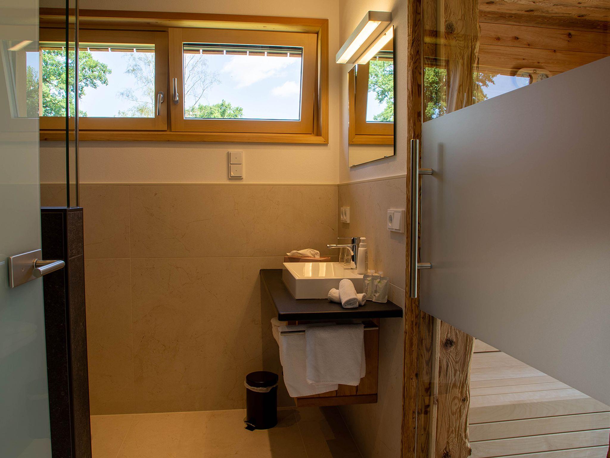 Was dürfen die Gäste im Ferienhaus im Fichtelgebirge erwarten? Das Haus bietet eine ausgesprochen hochwertige Ausstattung. Auf 59qm Wohnfläche und einer 25qm Sonnenterrasse mit einem professionellen in alle Richtungen verstellbaren Sonnenschirm lässt sich der Urlaub im Fichtelgebirge sehr angenehm gestalten. Zur Verfügung steht ein Schlafzimmer mit Boxspringbetten, eine hochwertige, vollausgestattete Küche sowie ein Bad mit großer Dusche (1,40 x 0,90 m) und eine geräumige Sauna (2,10 x 2,50m) für zwei Personen direkt im Ferienhaus zur alleinigen Nutzung.