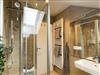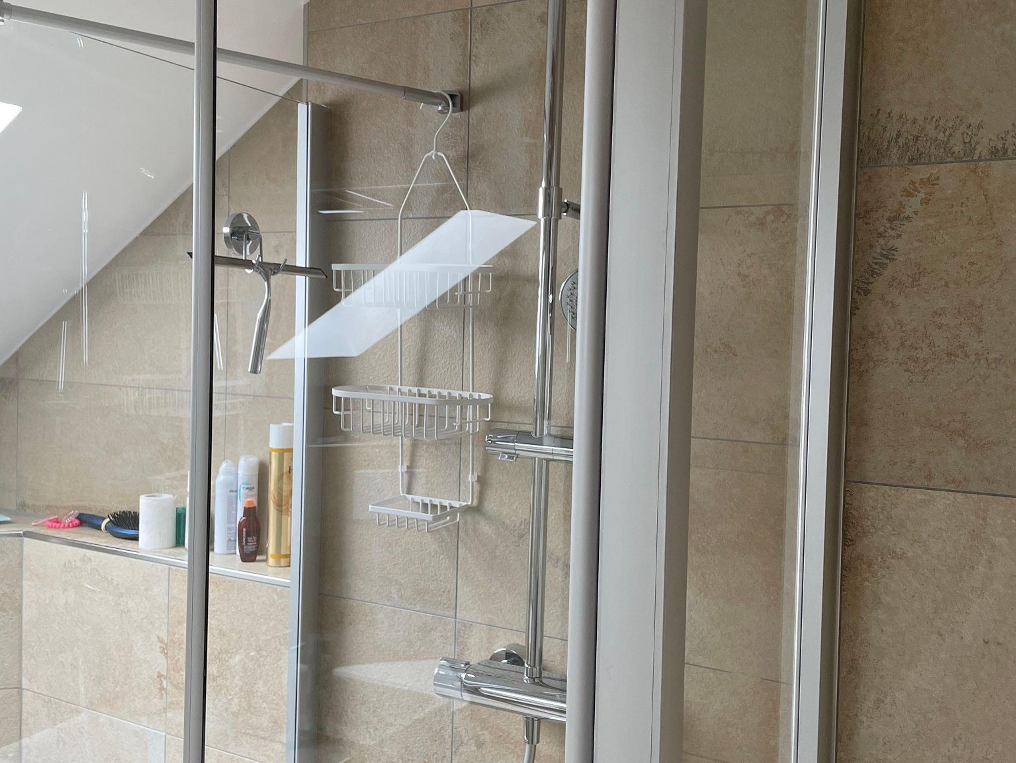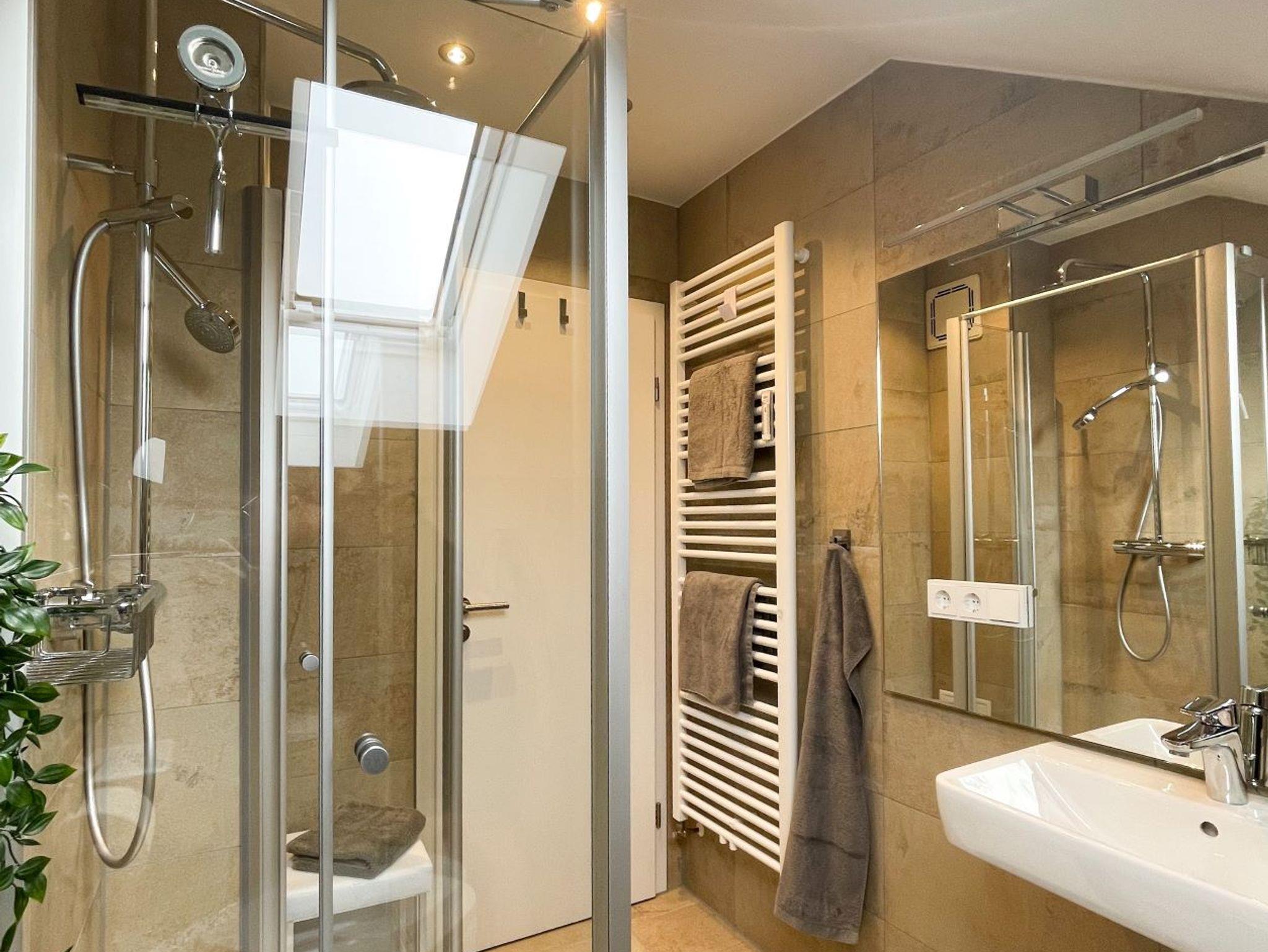 Das neue Bad mit ebenerdiger Dusche, Rainshower und großem Spiegel wurde in zeitloser Sandstein-Optik gestaltet.