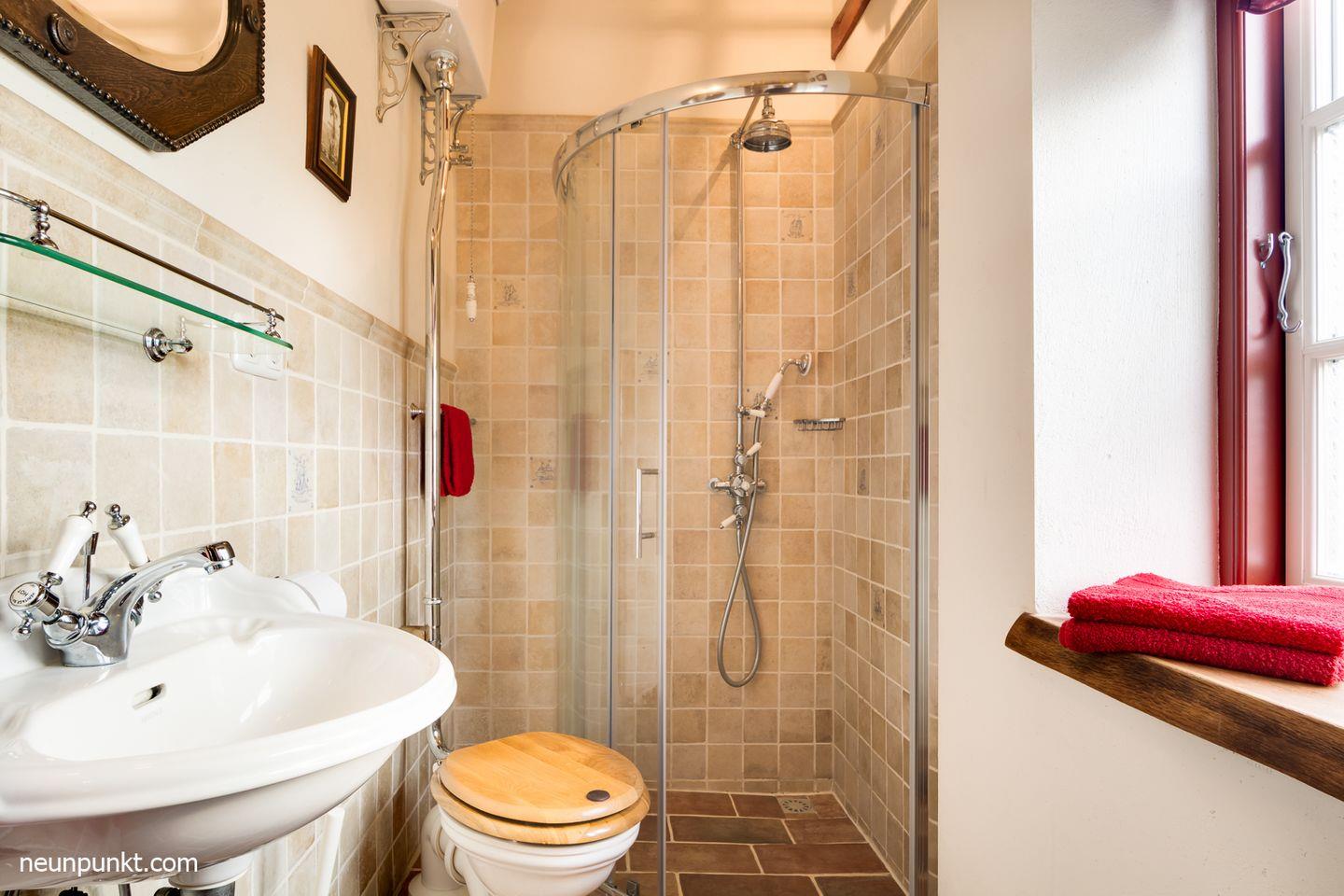 Das Schlafzimmer mit dem Doppelbett und das Bad mit der bodengleichen Dusche runden das kleine Ferienhaus ab.