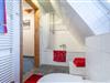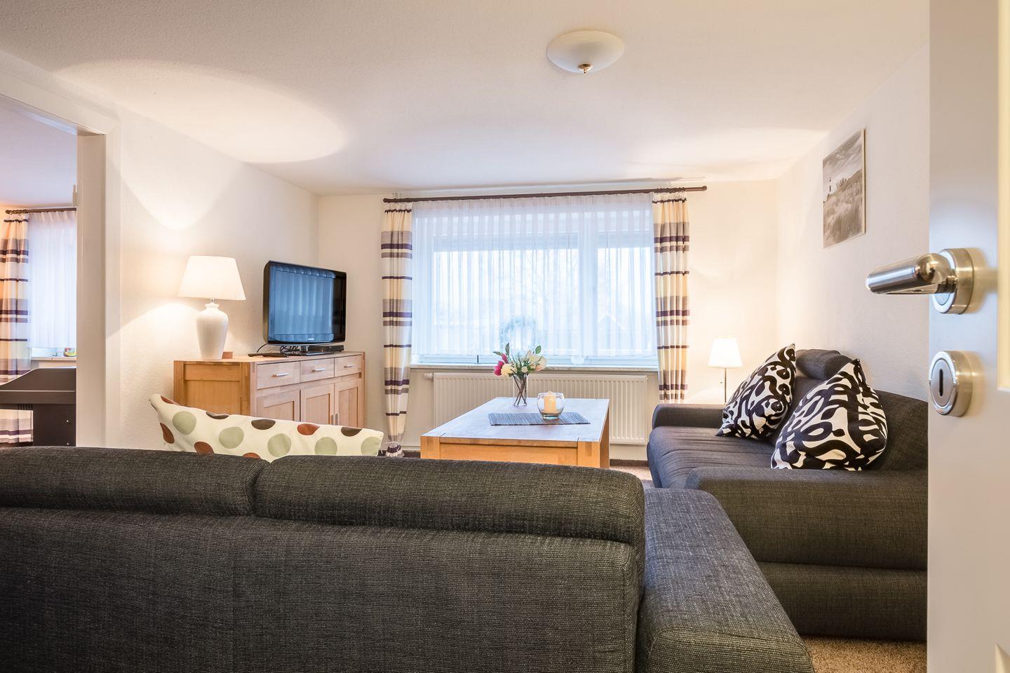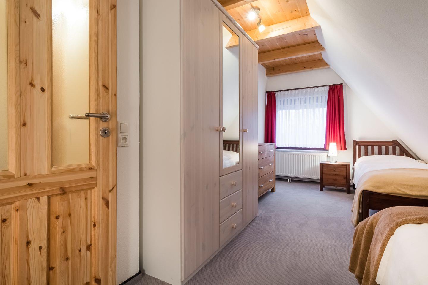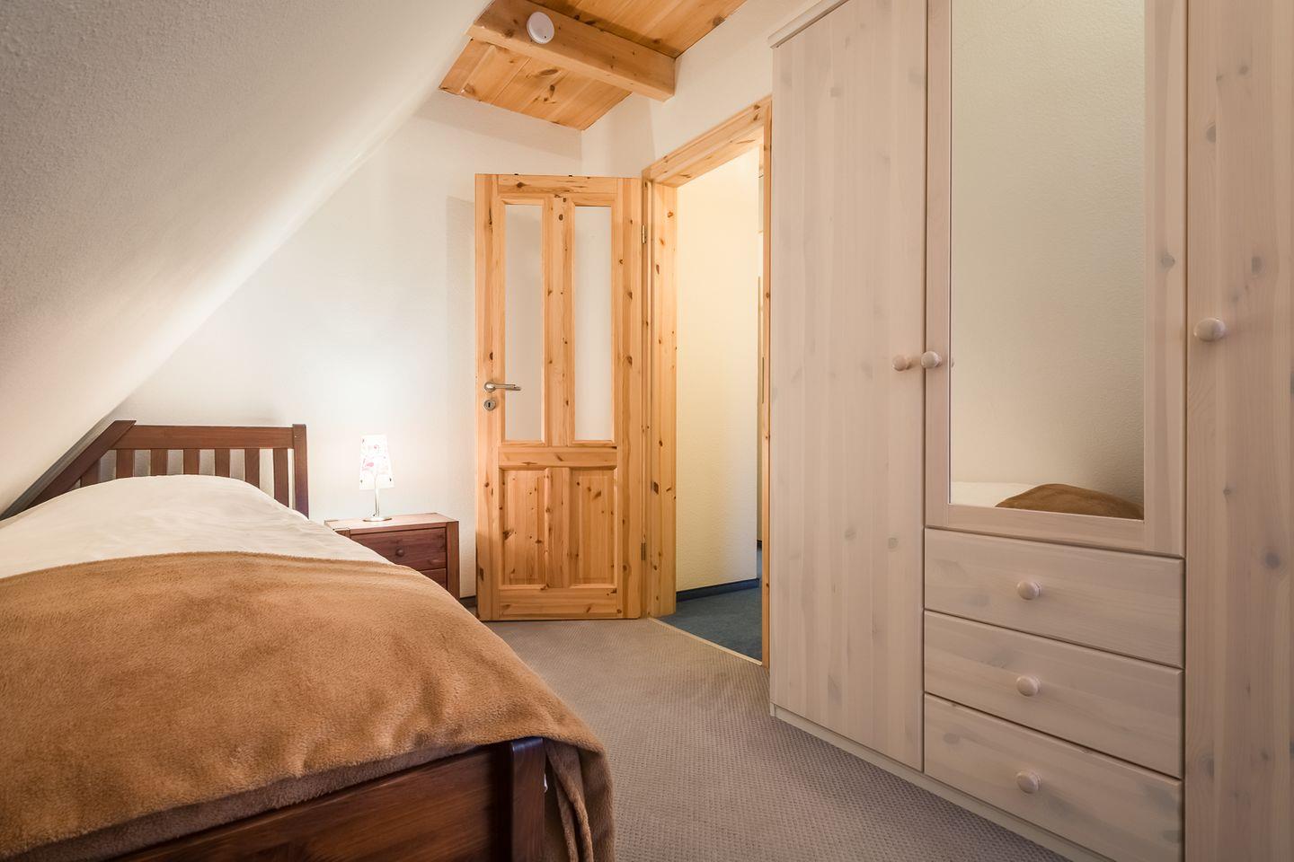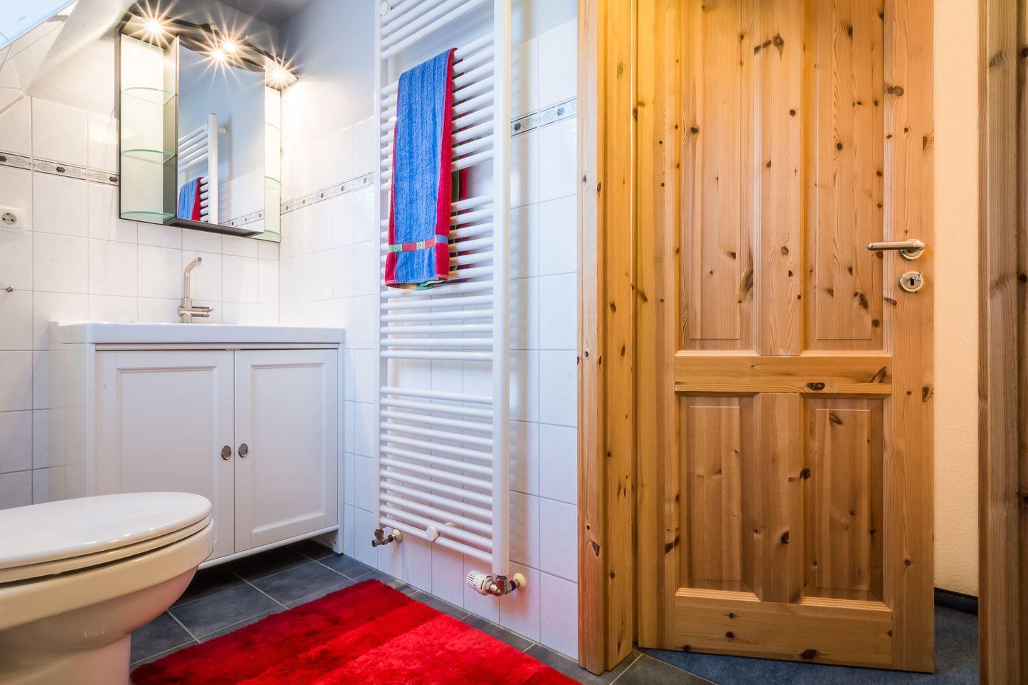 Im OG befinden sich ein Doppelschlafzimmer (140x200 cm) und ein Zimmer mit 2 Einzelbetten (je 90x200 cm), beide mit wunderschönem Schleiblick. Ein modernes Badezimmer mit Badewanne, Handtuchtrockner und Föhn runden den Komfort ab.