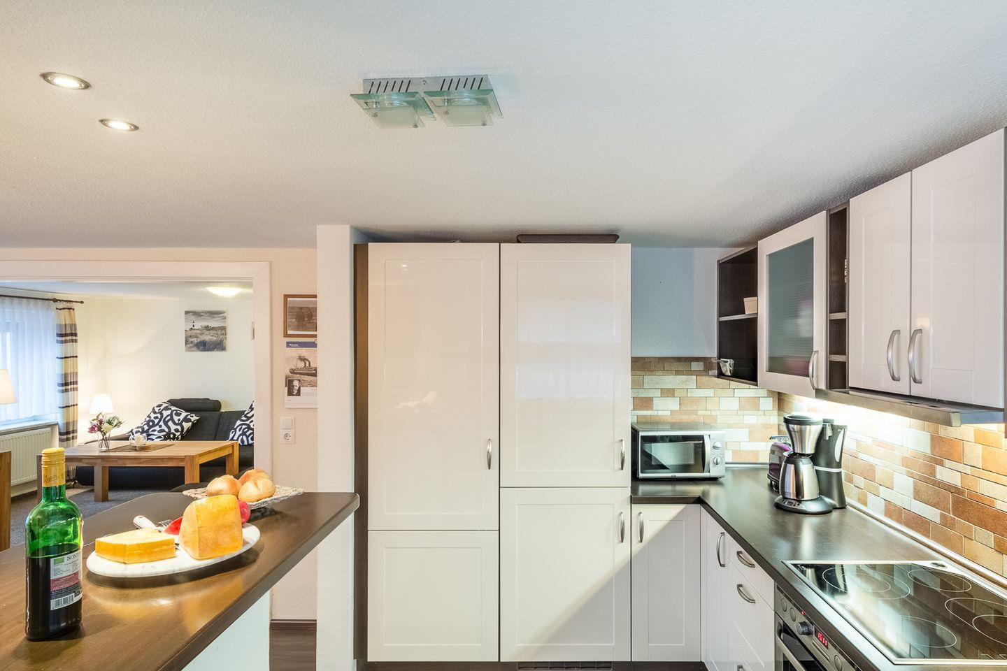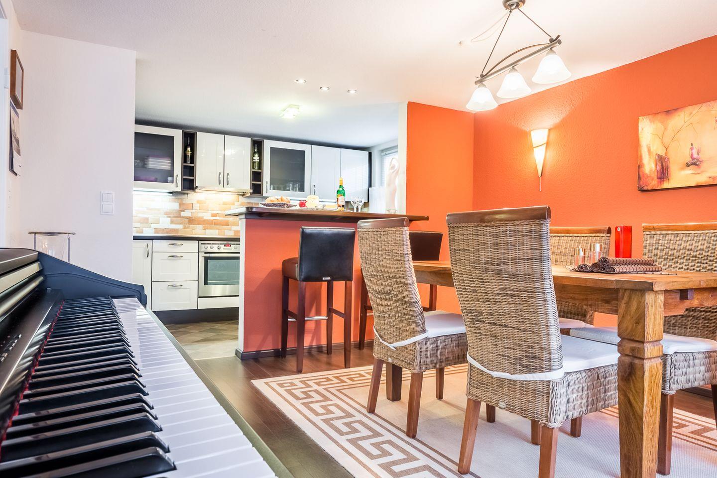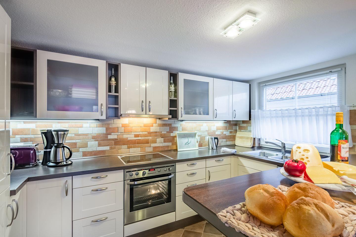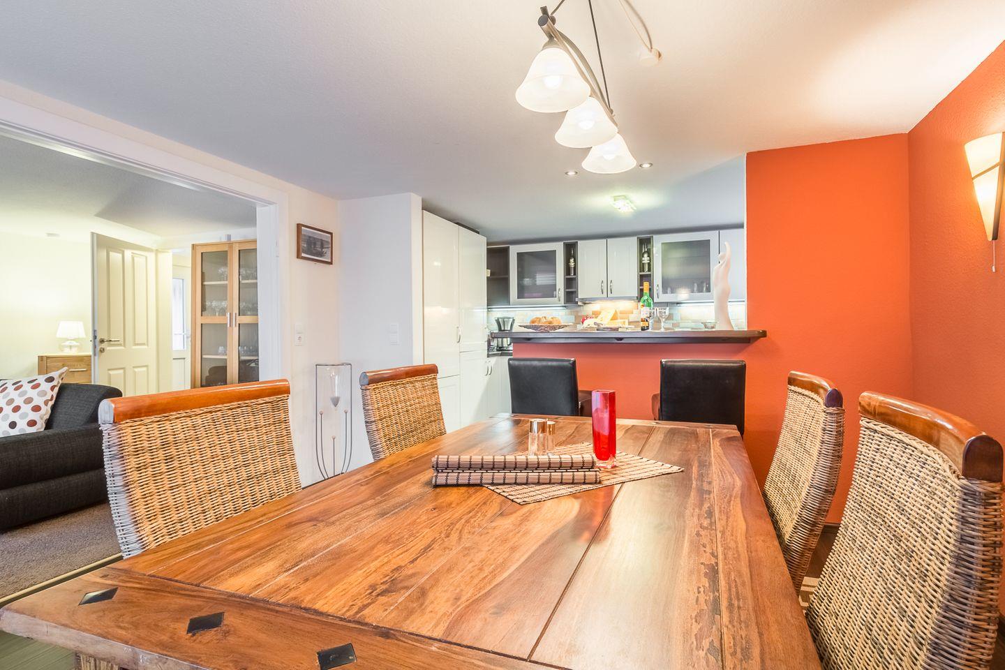Das Ferienhaus teilt sich auf in ein gemütliches Wohnzimmer mit großzügiger Sitzgruppe und Flachbild-TV, ein Esszimmer mit großem, rustikalen Esstisch und direktem Terrassenzugang. Daran schließt sich eine moderne offene Küche mit eingebauten Frühstückstresen an.