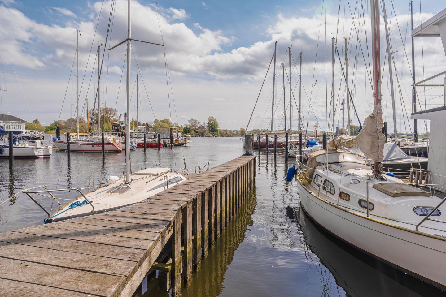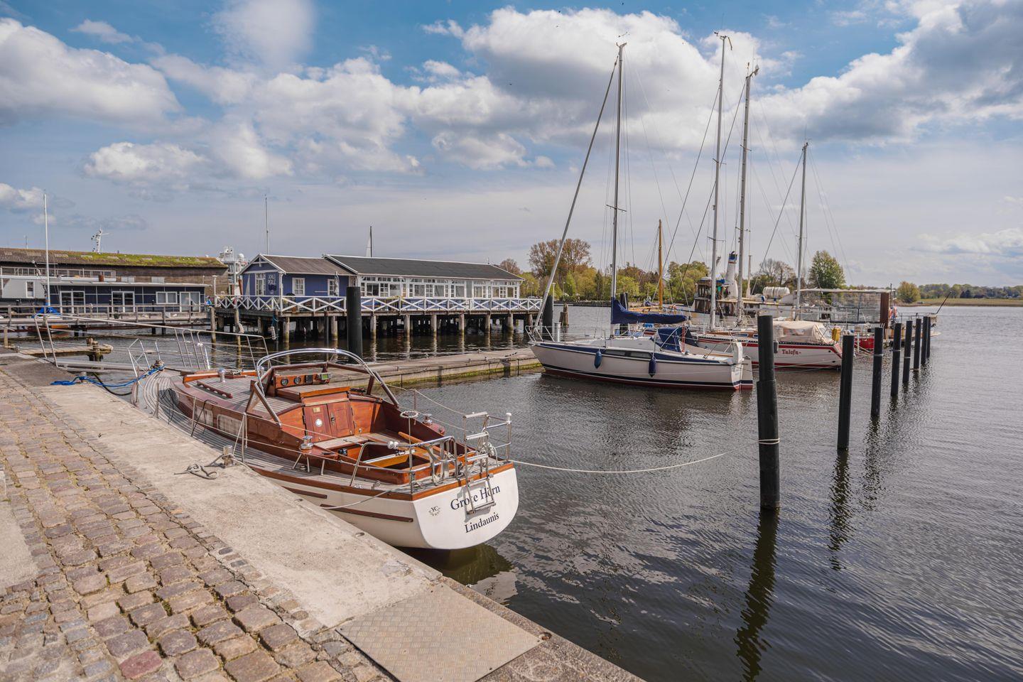 Gegen Gebühr können Sie ein Boot am Steg der Werft anlegen.