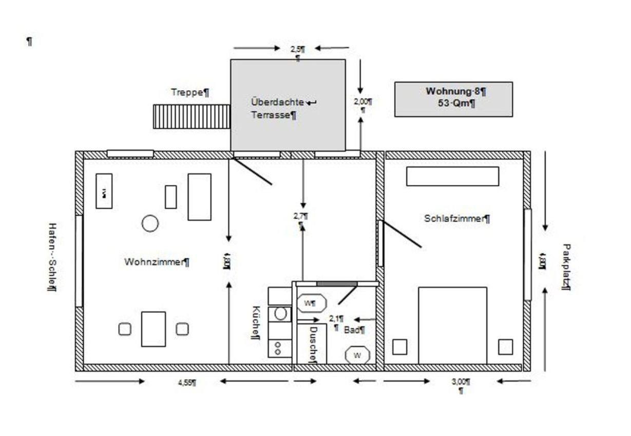 In dieser Ferienwohnung gibt es einen gemütlichen Wohn-/ Essraum mit offener Küche, ein überdachter Balkon, eine Küchenzeile Kühl-/ Gefrierkombination, 1 Schlafzimmer mit Doppelbett (2x 90x200cm) und ein Badezimmer mit Dusche. Auf dem großen Balkon können Sie die Werft und die Schlei beobachten und sonnige Stunden verbringen.
