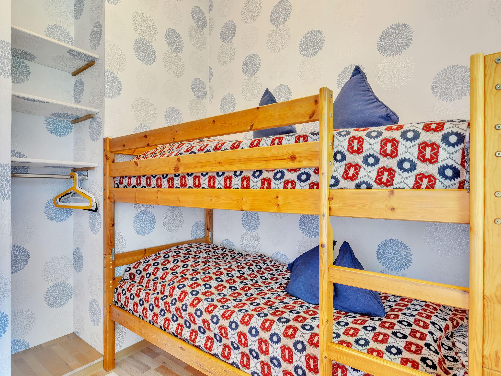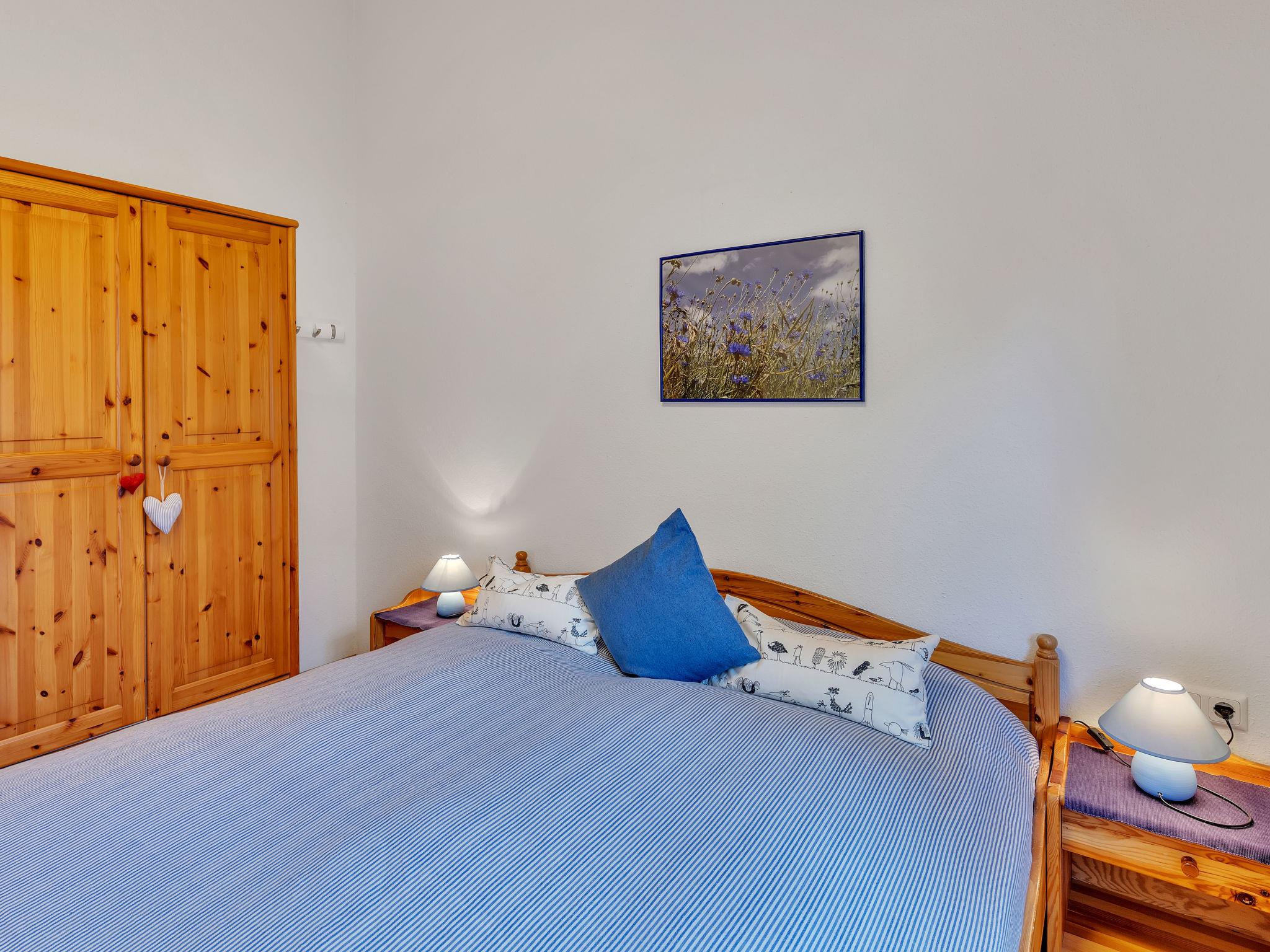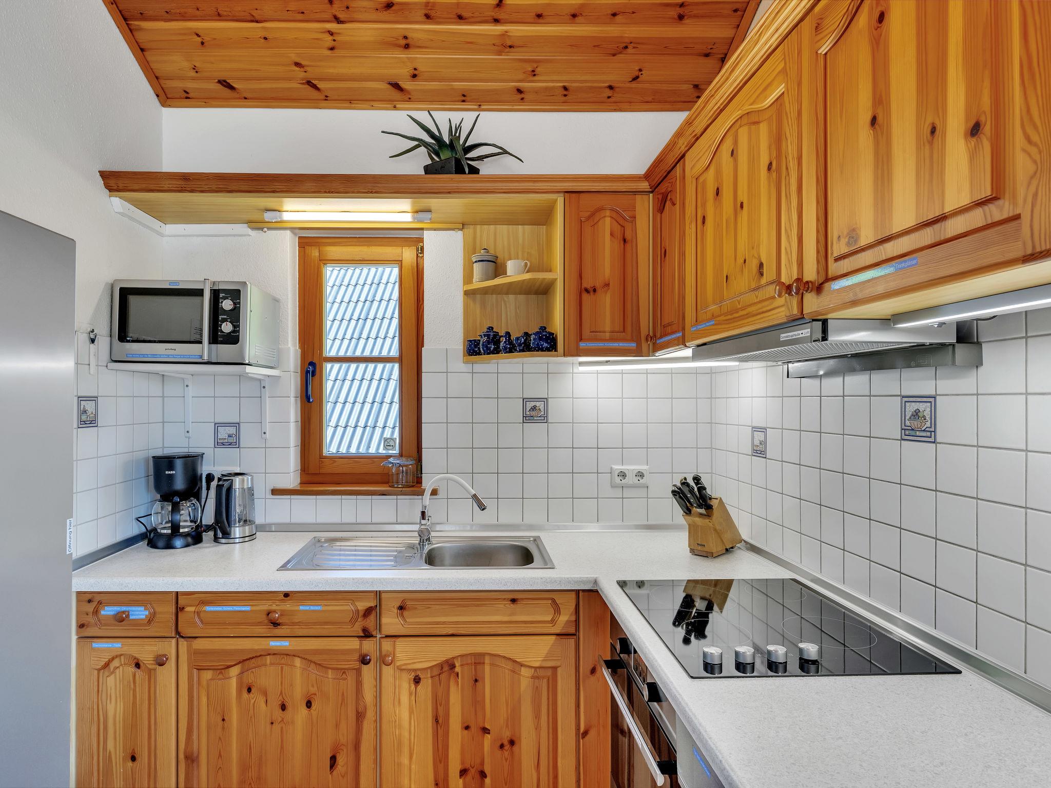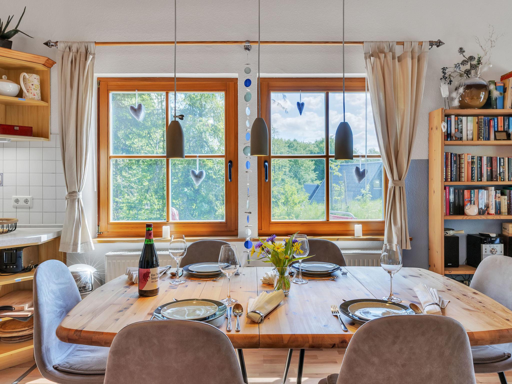 4-room house 80 m2. Very cosy furnishings: living/dining room with digital TV, flat screen and radio. Exit to the terrace. 1 room with 1 double bed. 1 room with 1 double bed. 1 room with 1 x 2 bunk beds. Open kitchen (oven, dishwasher, 4 ceramic glass hob hotplates, toaster, kettle, microwave, freezer, grill, electric coffee machine). Shower/WC, sep. WC. Gas heating. Wooden floors. Terrace 75 m2. Terrace furniture, deck chairs (2), box-room. View of the forest. Facilities: mosquito net, children's high chair, baby cot, hair dryer. Internet (WiFi, free). Please note: non-smoking house. Smoke alarm, fire extinguisher. Games, indoor and outdoor play equipment and mini golf clubs available. Bookings accepted for holiday purposes only.