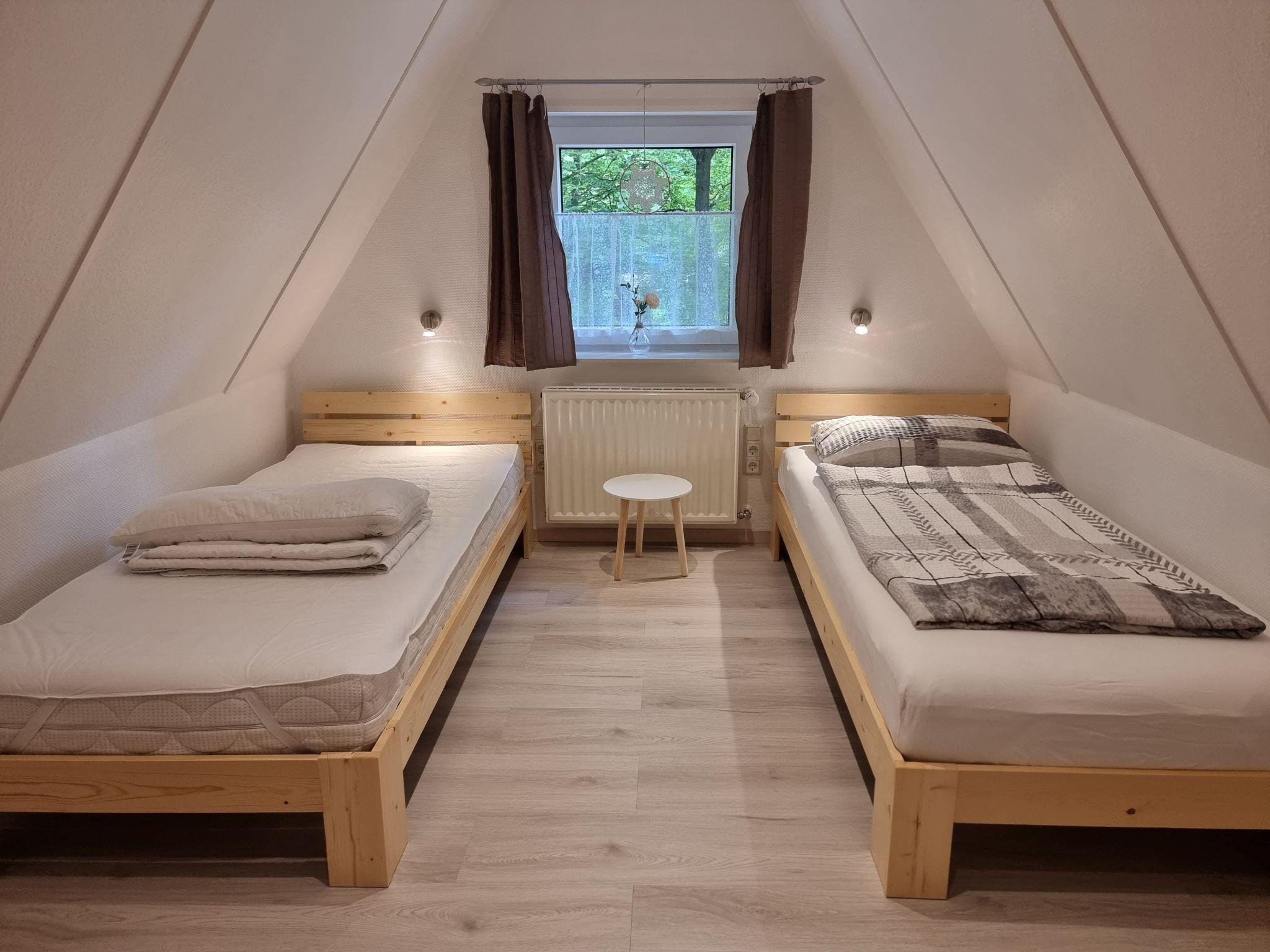 On the top floor there are two bedrooms, one bedroom with two single beds and one bedroom with one bed.