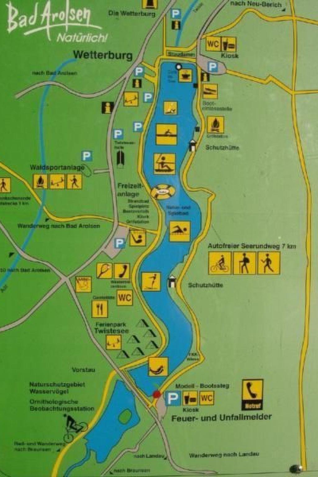 In the middle of the Waldecker Land, you will find a wonderful oasis of well-being here, directly on the Twistesee. Embedded in a forest landscape, in the first row to the Twistesee. Hiking trails and cycle paths lead you through the beautiful Waldecker Land. Bad Arolsen with its avenues and the magnificent castle, Mengeringhausen with its half-timbered houses, the Edersee or the Diemelsee, everything is within easy reach on cycle paths and footpaths. The Waldecker Land is the green lung of Hesse, in the centre of Germany. The holiday home is built in beautiful timber construction and is fully equipped. There is a bedroom with a 2x2 metre box-spring bed, 2 bedrooms each with a single bed and a pull-out sofa bed for 2 people in the living room. On the large terrace, which faces the lake, you can relax to the sound of birdsong and the rustling of the forest. The Twistesee can be reached after approx. 200 metres via a forest path. Ideal for families with children. The house belongs to a holiday park. The holiday park also has children's playgrounds and a mini-golf course. At the Twistesee there are restaurants, a lido, a water ski facility, a pedal boat hire and a 9-hole golf course with driving range. Unfortunately, pets are not allowed in our holiday home. Smoking is also not permitted in the holiday home. Linen packs consisting of bed linen, a shower towel and a hand towel can be ordered in advance. The final cleaning as well as the price for the linen sets must be paid in cash on arrival.