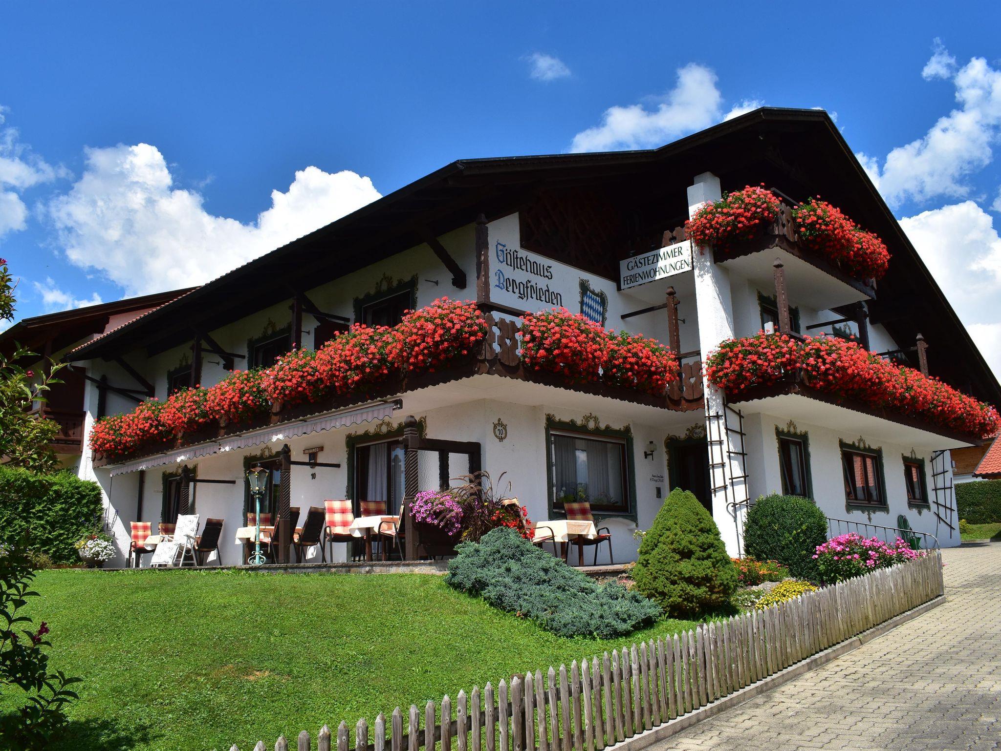 Gästehaus Bergfrieden: Natur pur erleben Erleben Sie unvergessliche Momente im Gästehaus Bergfrieden, wo sich Ruhe und Natur in perfekter Harmonie vereinen. Am ruhigen Ortsrand von Bad Bayersoien gelegen, bietet unsere Unterkunft den idealen Rückzugsort für alle, die Entspannung inmitten des wunderschönen Naturpark-Ammergauer-Alpen suchen. Genießen Sie den fantastischen Ausblick in die Berge und lassen Sie Ihren Alltag hinter sich.