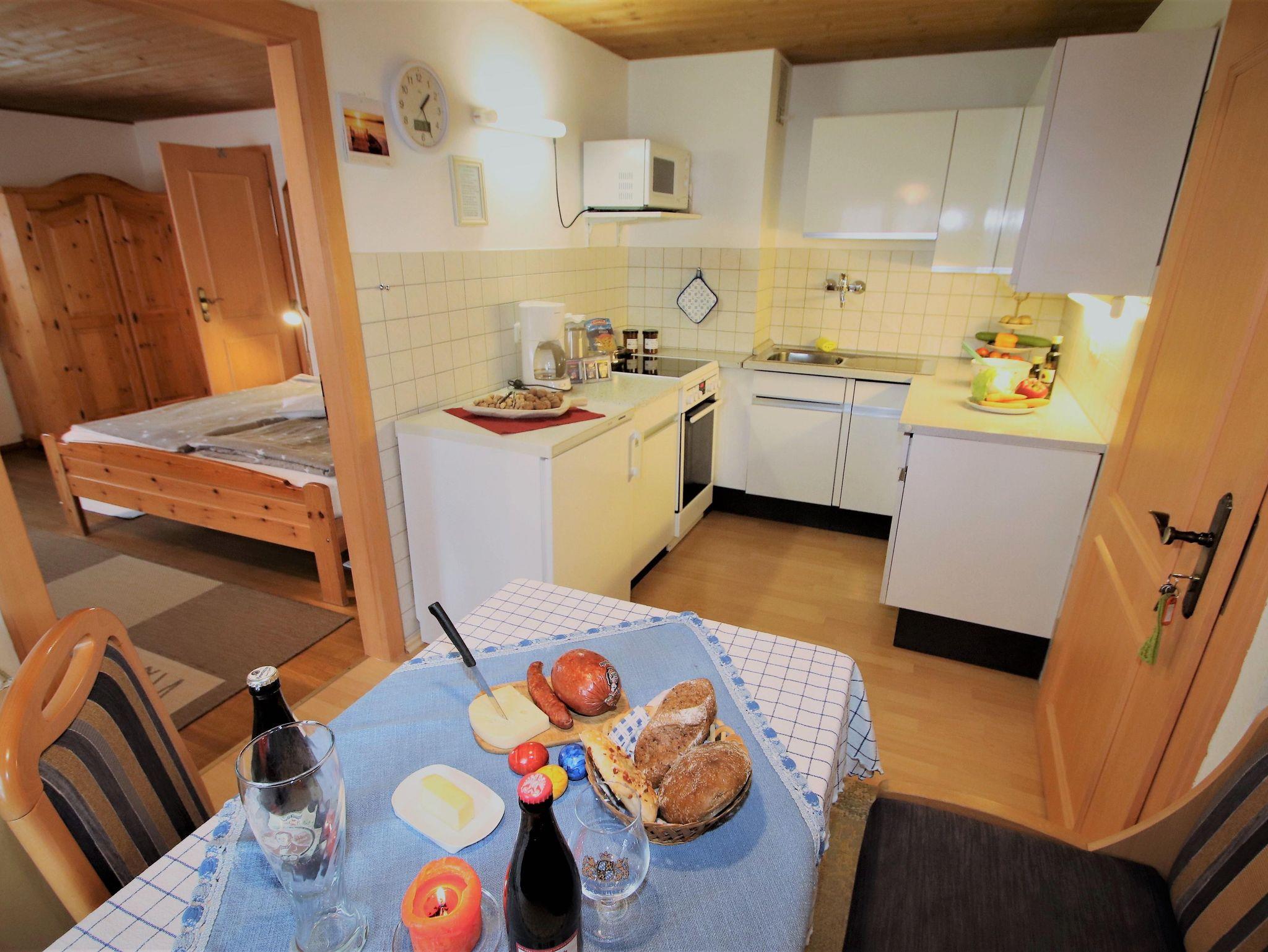 Ferienwohnung Bärli befindet sich im Parterre, ca. 32 qm, für max. 2 Personen. Aufgeteilt mit Wohn-/Schlafzimmer mit Doppelbett und Sitzecke, separate Küche mit Essecke. Die Wohnung ist rustikal und komplett eingerichtet, d. h. mit reichlich Geschirr, Gläser und Besteck, Bettwäsche, Handtücher (werden nach Bedarf gewechselt). Zusätzlich Mikrowelle, Eierkocher, Toaster, Brotmaschine, Kaffeemaschine, Wasserkocher, Backofen, Radio/CD, Farb-TV, Zentralheizung, Dusche/WC, Fön, Radiowecker, Telefon. Kostenloser Stellplatz am Haus vorhanden, Garage auf Anfrage und Gebühr vorhanden. Unser großer Garten mit Liegewiese, Grillplatz und mediterraner Sonnenterrasse lädt ein zum Verweilen und Entspannen. Liegestühle, Polster und Sonnenschirme sind kostenlos vorhanden. Als kostenlose Zusatzleistung erhalten Sie bei Übernachtung in unserem Haus die All-Inclusive KönigsCard.