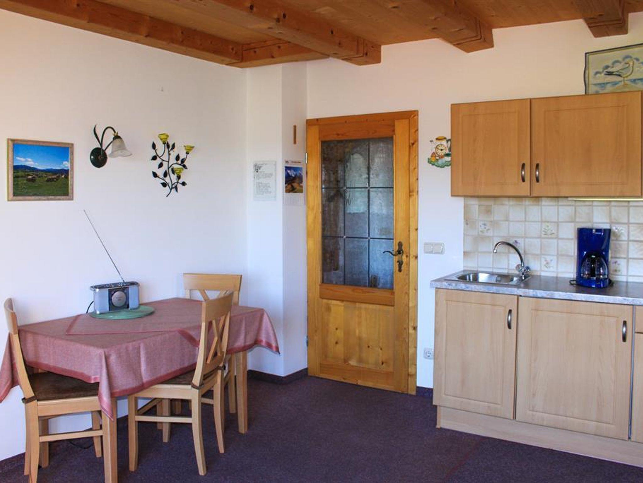 Im Landhausstil eingerichtete 45pm Ferienwohnung mit See- und Bergblick. Wohnküche mit Essecke, komplett eingerichtete Küchenzeile mit 2 Platten Cerankochfeld, Mikrowelle, Kaffeemaschine, Eier- und Wasserkocher, Toaster, Kühlschrank mit 3 Sterne Gefrierfach, Couchgarnitur, Flat TV mit Sat Anschluß, Direktwahltelefon, Radio, separates Schlafzimmer mit Doppelbett, Ganzkörperspiegel, extra Sitzecke, Wecker, Bad mit Fenster, Dusche und WC, Kosmetikspiegel, Fön, Staubsauger, möblierter Südbalkon und möblierte 30pm Süd-Ost Dachterrasse. An allen Fenstern bzw. Terrassentüren Fliegengitter. Im Preis inbegriffen: Endreinigung, Brötchenservice, Bett- und Tischwäsche, Hand- und Geschirrtücher, Reinigungsmittel, WLan.