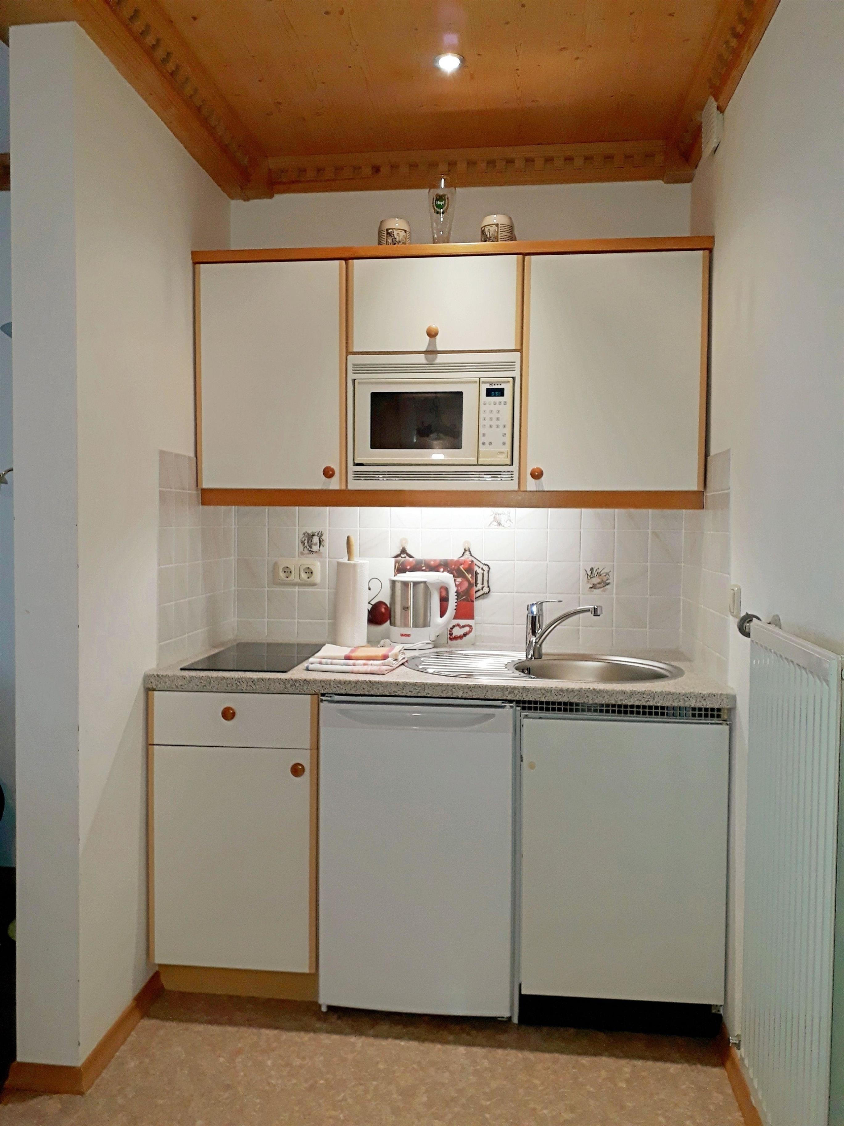 Gut ausgestatteter Kochnische, Essecke und gemütliche Sitzgruppe zum Relaxen.