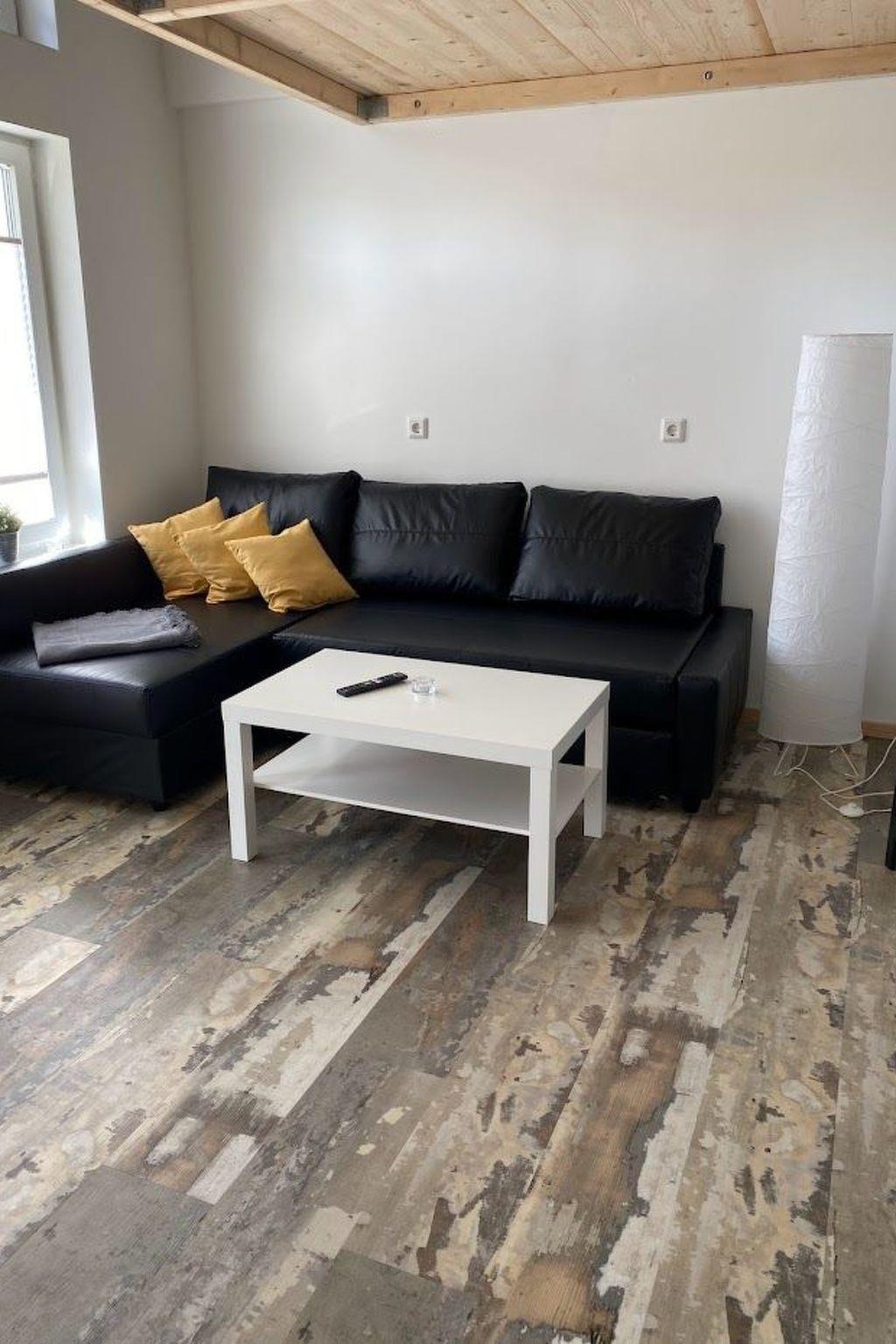 This flat was completed in April 2023. We have created a little space miracle here. As the ceiling is relatively high, we came up with the idea of building a loft bed under the ceiling. The living room below consists of an open-plan kitchen with a complete kitchenette (with ceramic hob, oven, fridge with freezer compartment, Senseo coffee machine, kettle and coffee machine for filter coffee and toaster, but without a dishwasher...) including a small dining table and a corner couch where you can sit "lümmeln" and watch TV! A small wooden staircase leads to the sleeping area and under the stairs is the WC. There is a real glass shower that can be seen from the kitchen and living area. If you don't like this, you can move the privacy screen so that it is less open. Everything is fitted with non-slip, hard-wearing laminate flooring, naturally with underfloor heating.