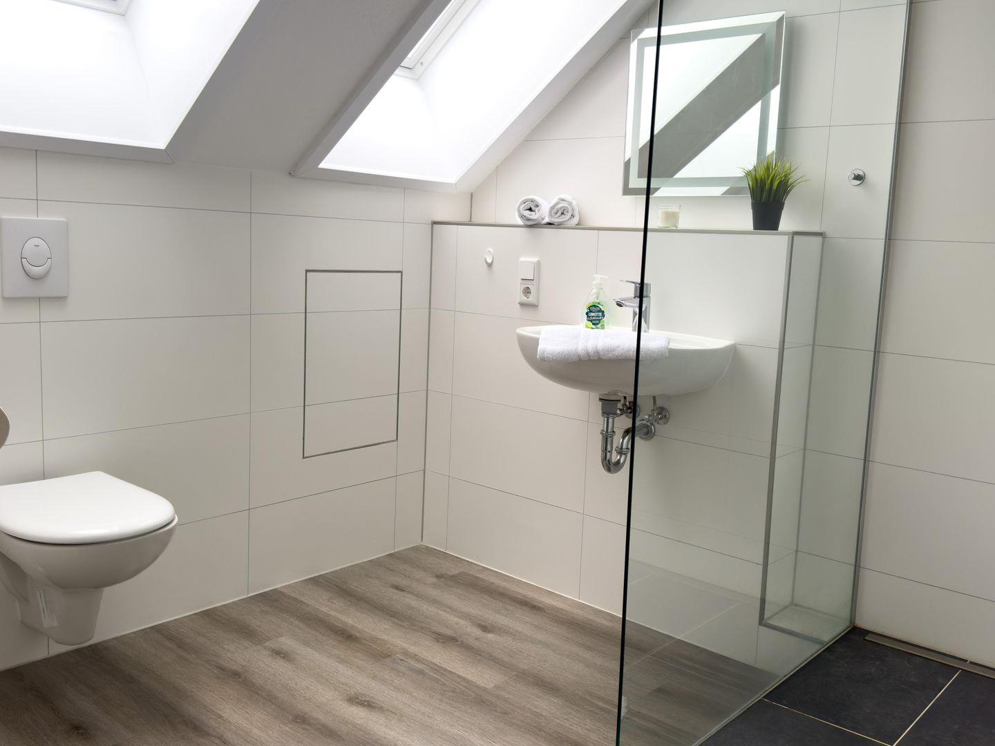 Das moderne Badezimmer verfu¨gt u¨ber eine offene Dusche, WC, Waschbecken und Haartrockner. Handtu¨cher fu¨r den Ku¨chenbereich werden bereitgestellt. Eine Waschmaschine zur Eigennutzung sowie ein Staubsauger erhöhen den Alltagskomfort.