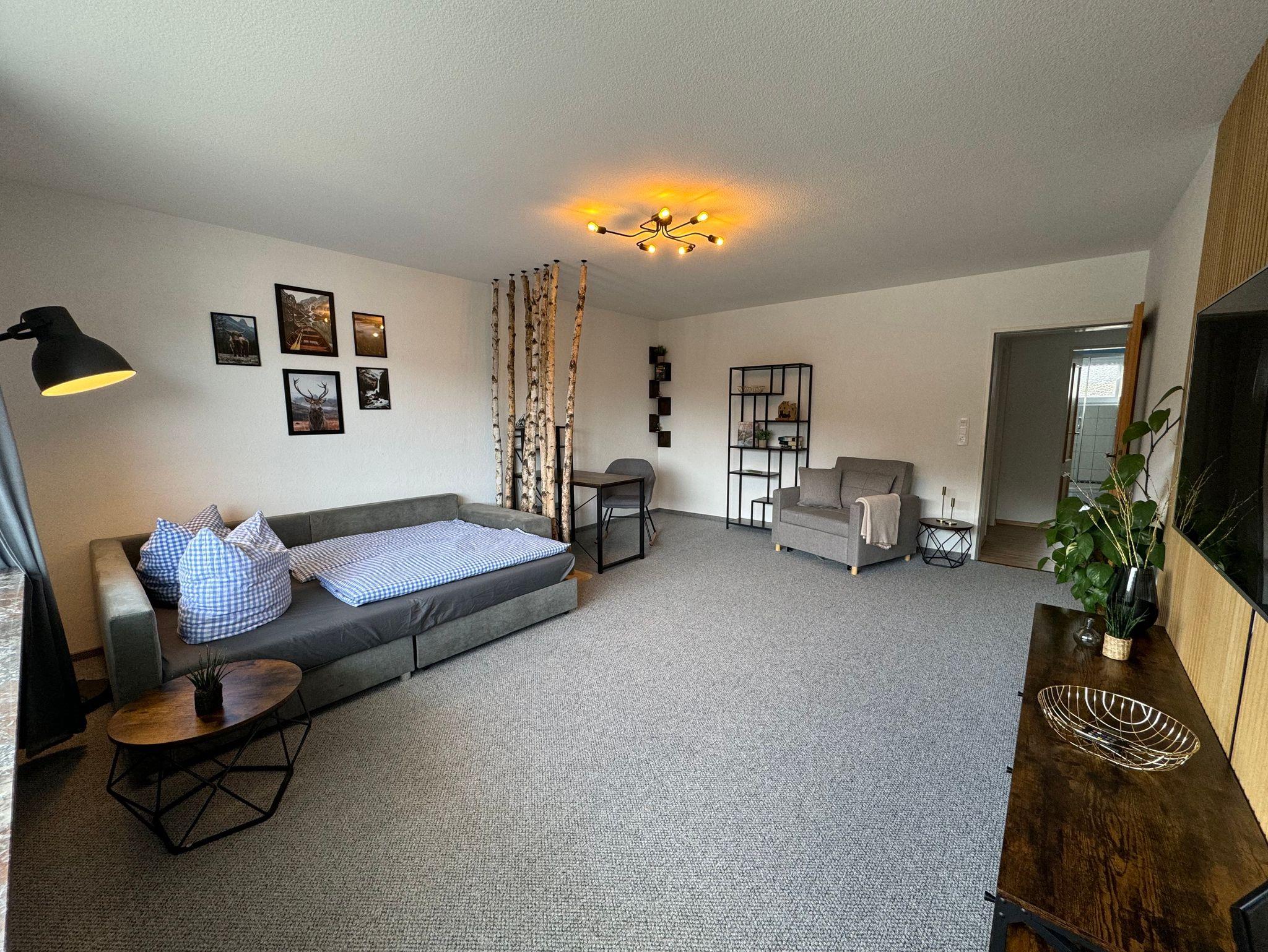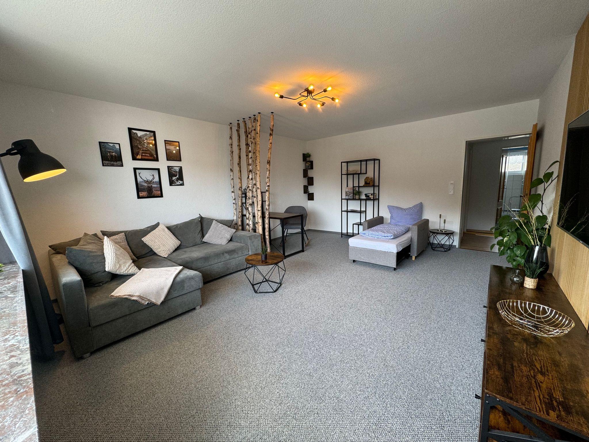 Unsere Ferienwohnung ist 66qm groß und bietet Platz für bis zu 5 Personen (max. 4 erwachsene Personen). Die Ferienwohnung liegt im Erdgeschoss und ist über 3 Stufen erreichbar. Im großzügigen Wohnzimmer mit Balkon finden Sie ein gemütliches Schlafsofa und eine Büroecke mit Schreibtisch. Der 55 Zoll Smart LED TV rundet das Angebot ab. Das separate Schlafzimmer verfügt über ein 180 x 200cm Boxspringbett mit 40 Zoll Smart LED TV. Die Küche ist voll ausgestattet und verfügt unter anderem über einen Backofen, eine Spülmaschine, eine Kaffeemaschine, einen Wasserkocher, Teller, Besteck, etc.. Wlan ist inklusive, ein Parkplatz steht ebenfalls kostenfrei zur Verfügung.