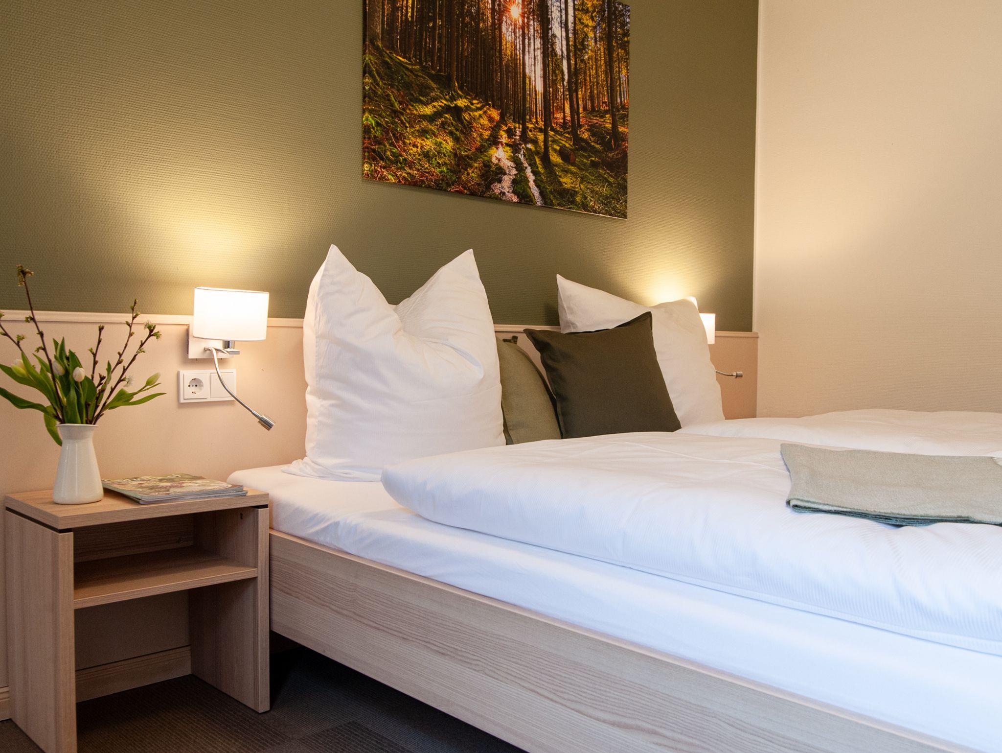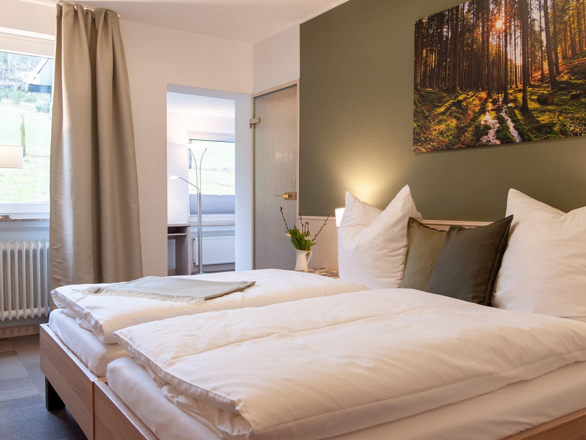 Unsere Vierbettzimmer bestehen aus einem Doppelbett und zwei Einzelbetten, in jedem Raum hängt ein Fernsehen. Zimmer Nr. 2 (ca. 27 qm) besteht aus 2 Schlafräumen und ist nur durch einen kleinen Durchgang ohne Tür getrennt. Zimmer Nr. 7 (ca. 26 qm) hat ebenfalls zwei Schlafräume, diese sind jedoch durch einen kleinen Flur voneinander getrennt und das Badezimmer liegt zwischen den beiden Räumen. Die Zimmer bieten einen Blick auf die umliegenden Wiesen und Wälder.