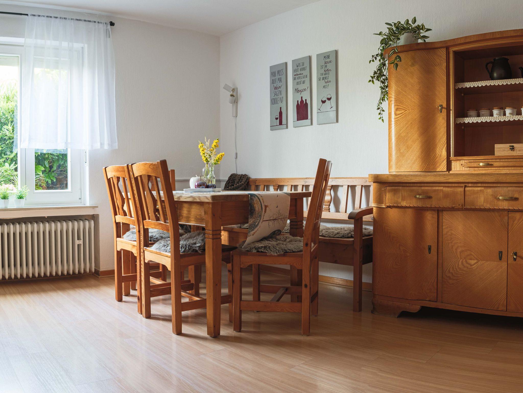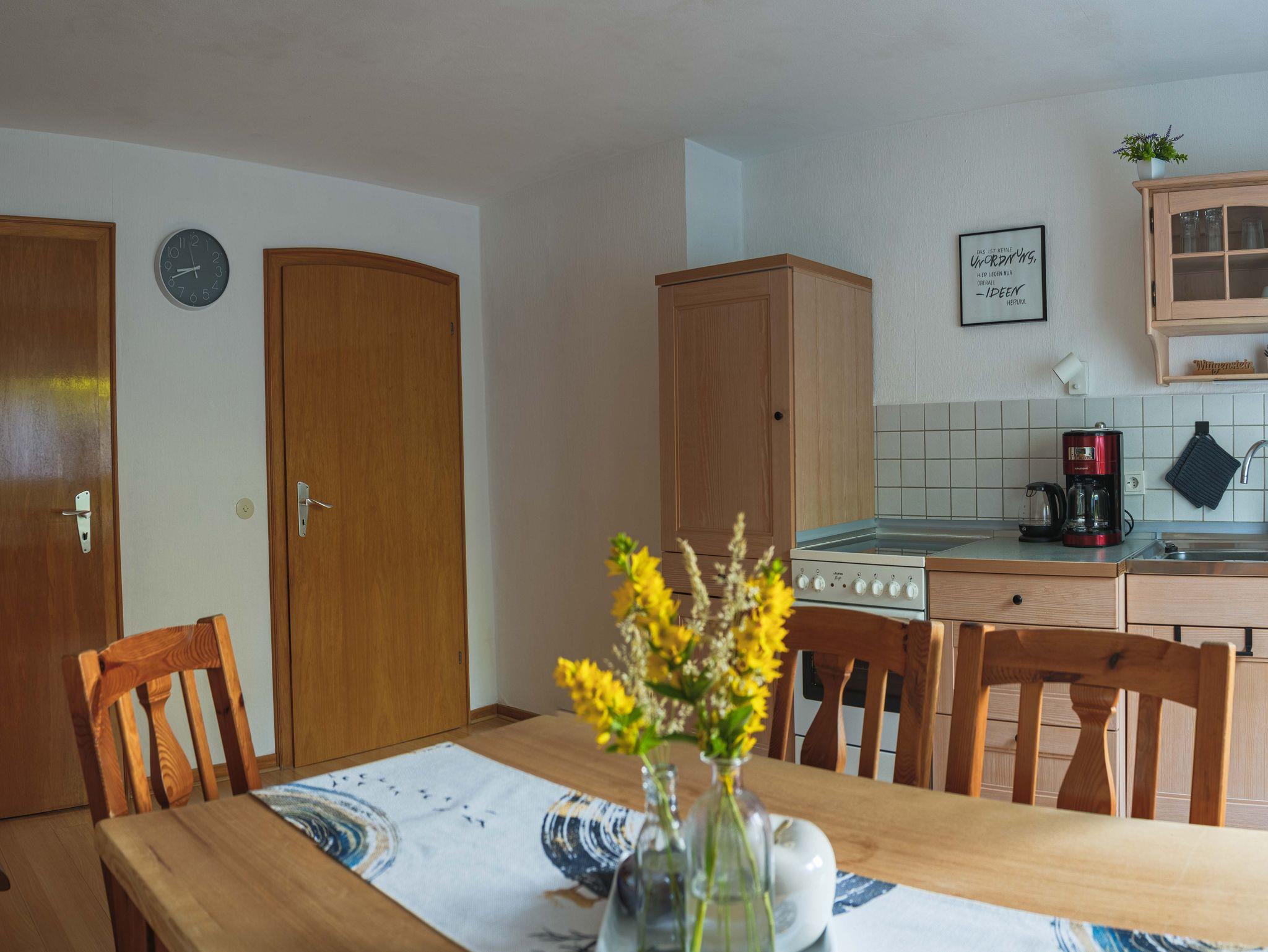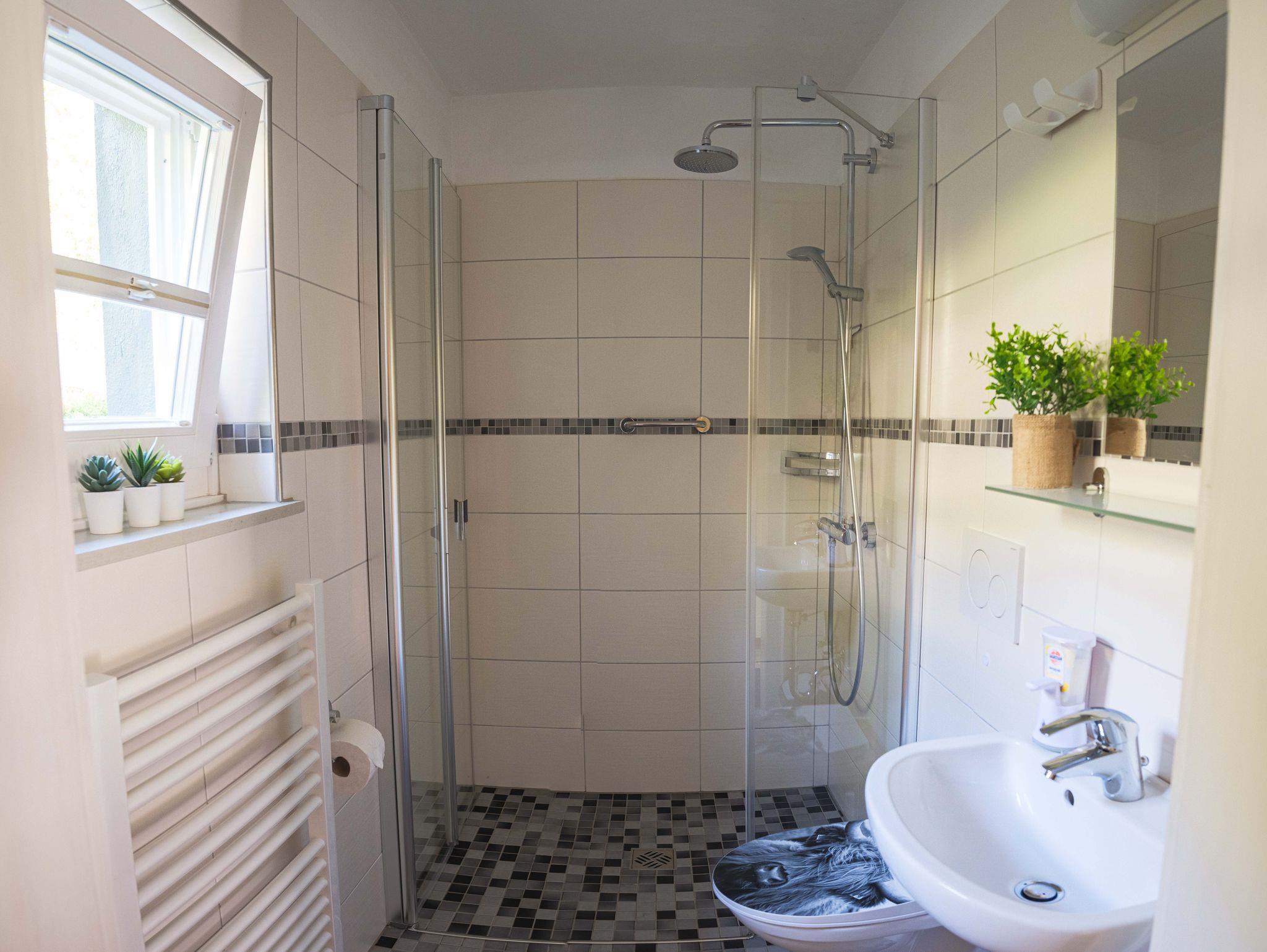 Im Erdgeschoss befindet sich ein Doppelzimmer, eine gemütliche Küche mit Essbereich und ein Duschbad.