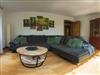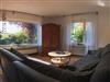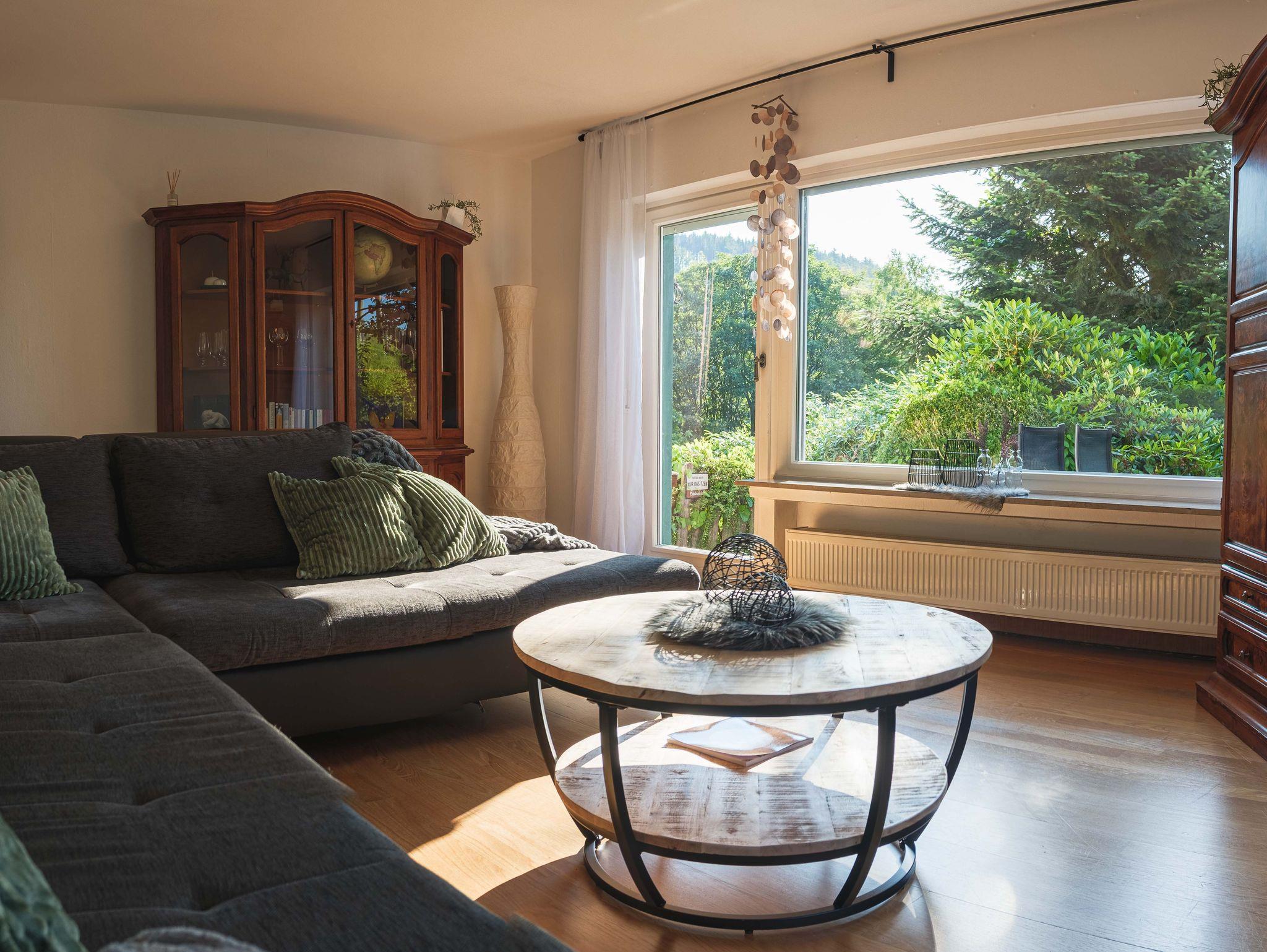 Das grosse Wohnzimmer mit Panoramafenster und Zugang zu Terrasse und Garten bietet eine großzügige Couch mit ausreichend Platz für gemütliche Fernsehabende.