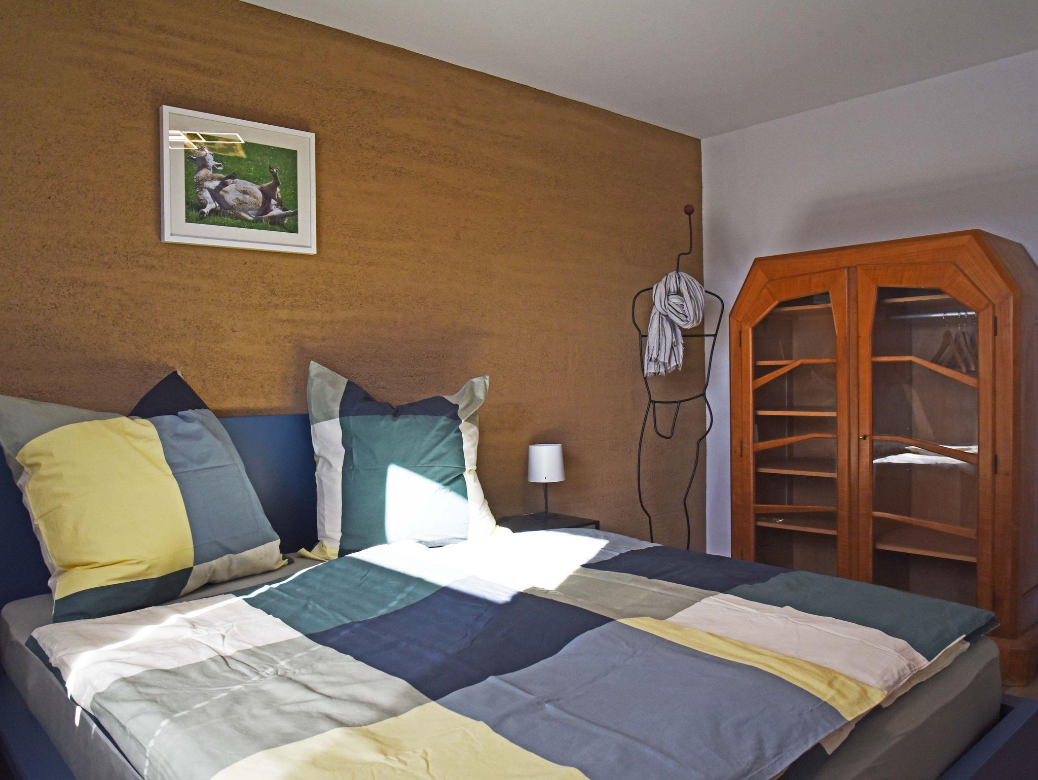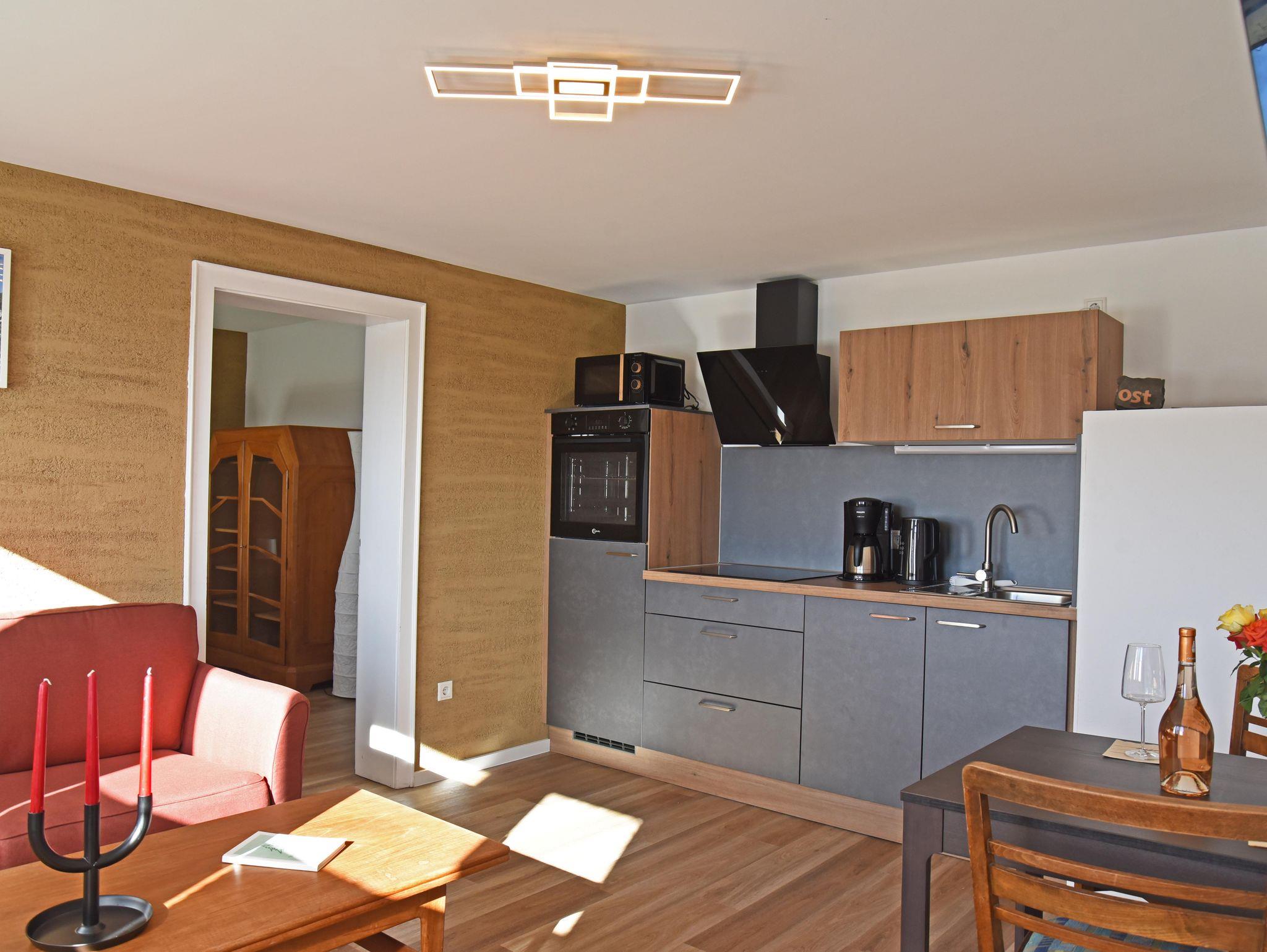 Die Wohnung bietet zwei gemütliche Zimmer mit Küchenzeile, ein kleines Bad mit Dusche sowie einen überdachten Balkon mit Zugang zum Garten. Kleine Annehmlichkeiten lassen den Aufenthalt zum Genuss werden: im Bad bringt ein beheizbarer Spiegel auch nach dem Duschen ein klares Bild. Im Schlafzimmer sorgt ein zusätzlicher Verdunkelungsvorhang für einen ruhigen Schlaf bis in den Tag hinein. Auf Wunsch gibt es ein Zustellbett für ein kleines Kind. Die Küchenzeile bietet mit Induktionskochfeld, höher gelegtem Backofen, zusätzlicher Mikrowelle und einer Kühl- Gefrierkombi für angenehmen Komfort. Und vom gemütlichen Sofa aus lässt sich das Smart-TV für die unterschiedlichsten Medien nutzen. Die teilweise offen mit Lehm verputzen Wände sorgen für eine gemütliche Atmosphäre und ein sehr gutes Raumklima. E-Bikes finden einen sicheren Raum und für das Auto gibt es einen trockenen Platz im Carport.