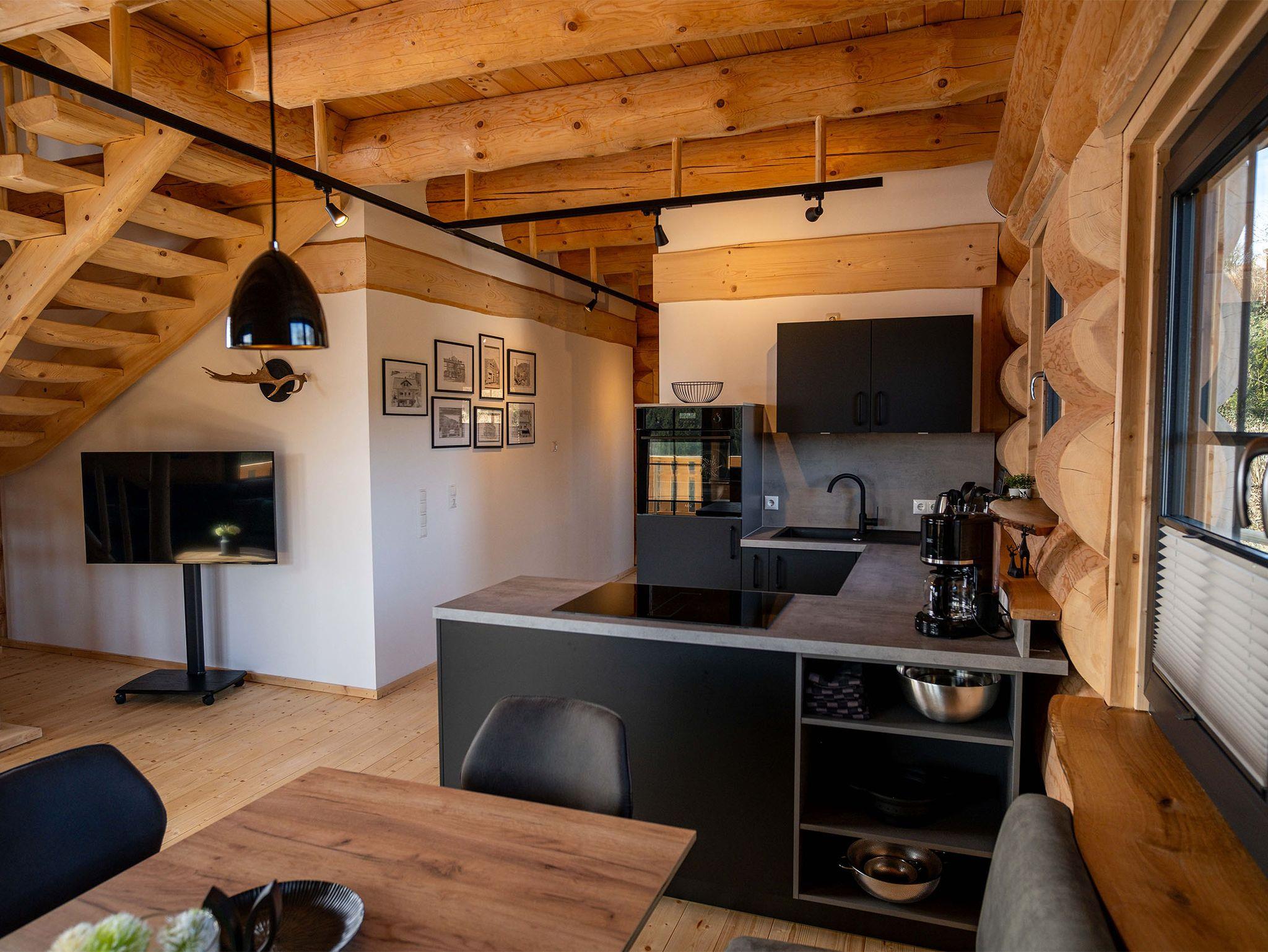 Willkommen in der Großen Fichte – Ihrem gemütlichen Naturstammblockhaus mitten im Grünen! Erleben Sie unvergessliche Tage in unserer liebevoll handgefertigten Ferienunterkunft Fichtenhaus. Auf rund 85 qm erstreckt sich die Große Fichte über zwei Etagen und bietet Platz für bis zu sechs Personen. Hier vereinen sich rustikaler Charme und moderner Komfort zu einem einzigartigen Wohnerlebnis. Ihr Rückzugsort mit Wohlfühlgarantie. Bereits beim Betreten des Erdgeschosses empfängt Sie ein großzügiger, offener Wohnbereich. Die voll ausgestattete Küche mit Kühl-Gefrierkombination, Backofen, Geschirrspüler, Toaster, Wasserkocher, Kaffeemaschine und Induktionskochfeld lässt keine Wünsche offen. Ob ausgedehnte Frühstücke oder gemeinsame Kochabende – der gemütliche Essbereich lädt zum Verweilen ein. Direkt angrenzend befindet sich der behagliche Wohnbereich mit einer großen, ausziehbaren Couch und TV. Hier können Sie entspannte Stunden mit Ihren Liebsten verbringen. Ein separates WC im Eingangsbereich sorgt für zusätzlichen Komfort.Panoramablick & Natur pur ! Vom Wohnbereich aus gelangen Sie auf den umlaufenden Balkon – ein wahres Highlight der Unterkunft. Genießen Sie von hier aus den atemberaubenden Blick über das Tal und die dichten Wälder der Gemeinde Wingeshausen. Ob beim Frühstück in der Morgensonne oder bei einem Glas Wein am Abend – dieser Ort lädt zum Träumen ein. Über die handgefertigte Holztreppe erreichen Sie das Obergeschoss mit drei gemütlichen Doppelschlafzimmern. Hier erwarten Sie zwei Betten mit 160 cm Breite und ein großzügiges Bett mit 180 cm Breite – alle ausgestattet mit hochwertigen Einzelmatratzen für optimalen Schlafkomfort in natürlicher Atmosphäre. Auf Wunsch stellen wir Ihnen gerne ein Babybett und einen Hochstuhl zur Verfügung. Ein charmantes Duschbad sorgt für einen erfrischenden Start in den Tag. Und für die Abenteuerlustigen: Die offene Galerie begeistert mit einem angebrachten Fischernetz – perfekt zum Klettern, Entspannen oder einfach zum Genießen des traumhaften Ausblicks auf die Natur.