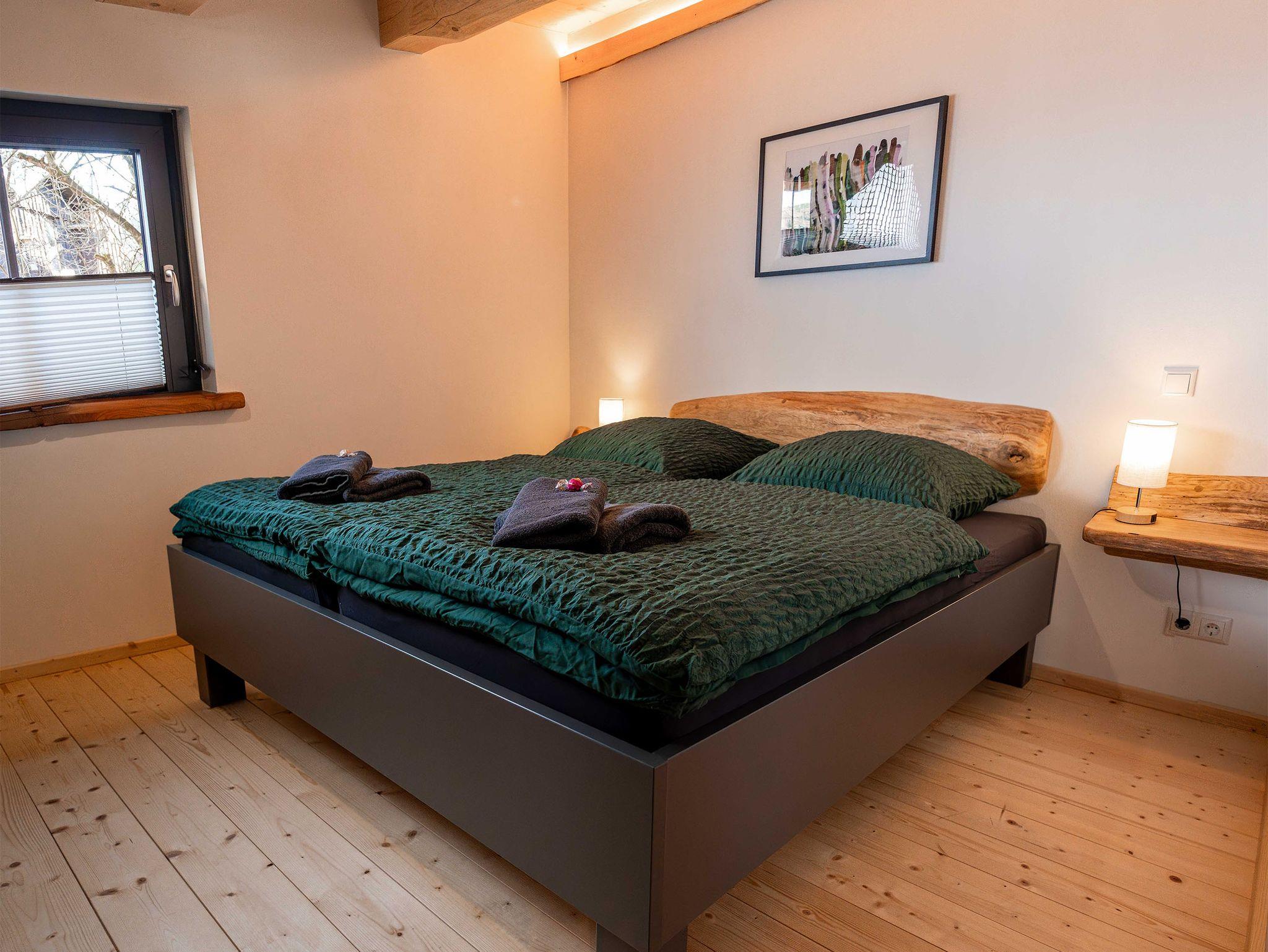 Das stilvolle Schlafzimmer ist mit einem komfortablen Doppelbett und einem geräumigen Kleiderschrank ausgestattet. Auf Wunsch stellen wir Ihnen gerne ein Babybett und einen Hochstuhl zur Verfügung. Direkt gegenüber befindet sich das einladende Duschbad – ideal für einen frischen Start in den Tag.