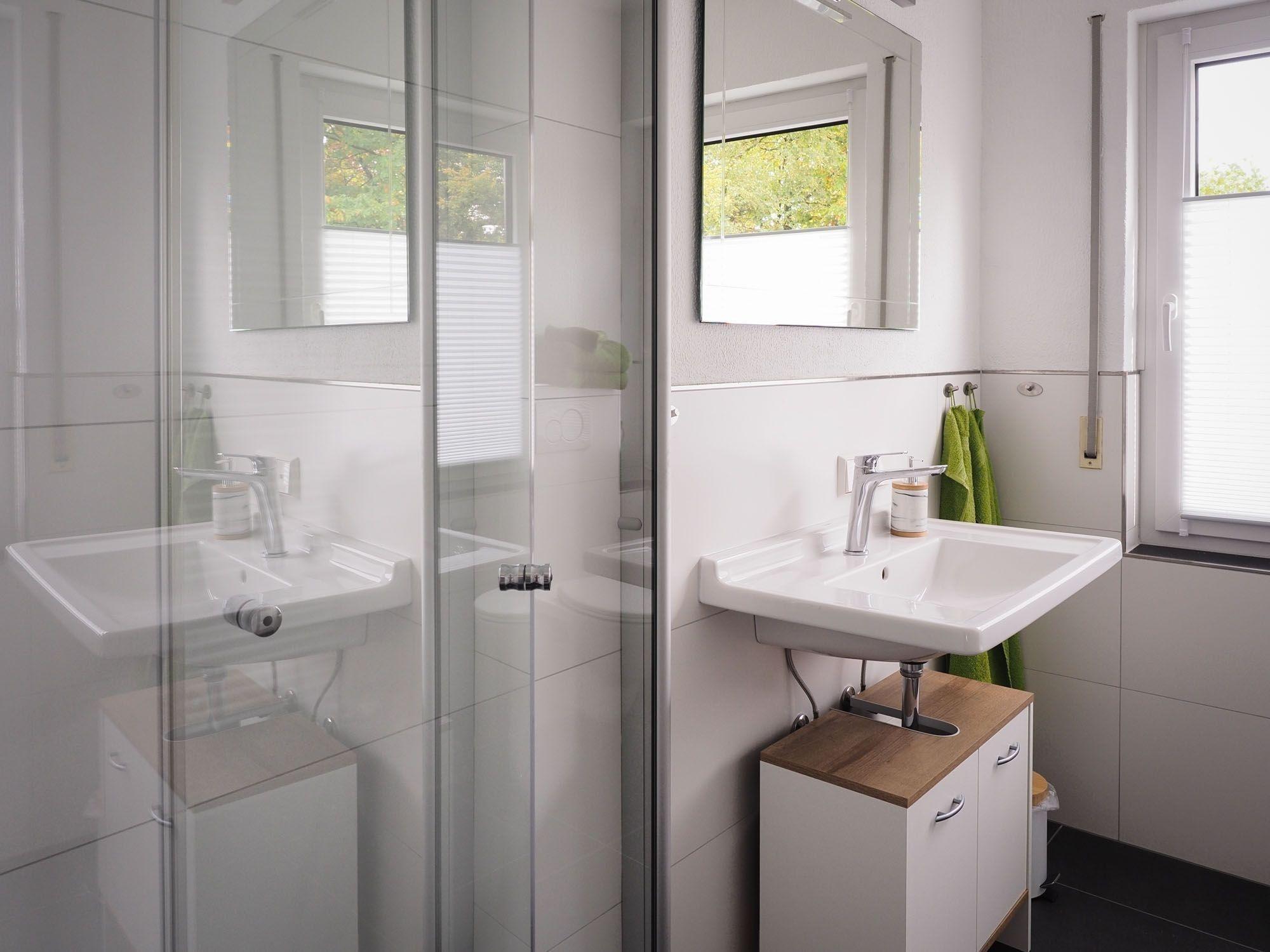 Im modernen Bad sorgt eine große, bodengleiche Dusche für Komfort.