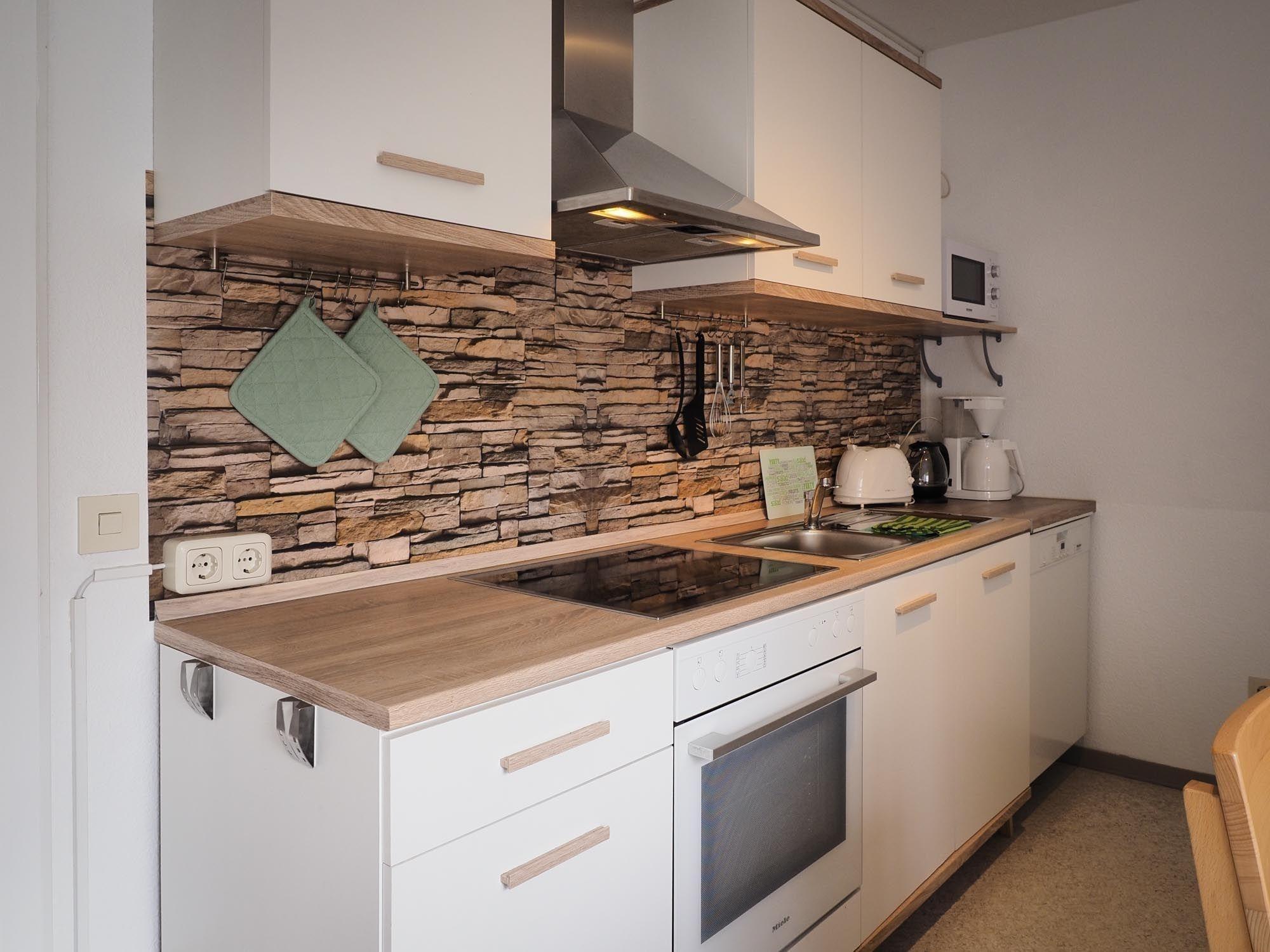 Die helle, voll ausgestattete Küche bietet alles, was man braucht: Kühlschrank, Spülmaschine, Backofen, Ceranfeld mit vier Platten, Mikrowelle, Kaffeemaschine, Toaster und einen weiteren Esstisch für vier Personen.
