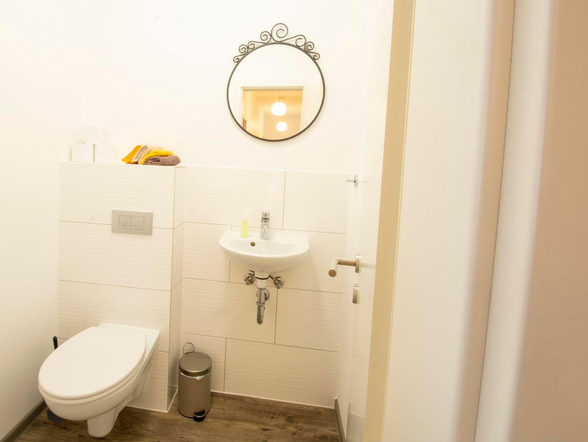 Gäste-WC: innenliegendes Gäste-WC (Vorwand-WC) mit Handwaschbecken, Spiegel und Ablage