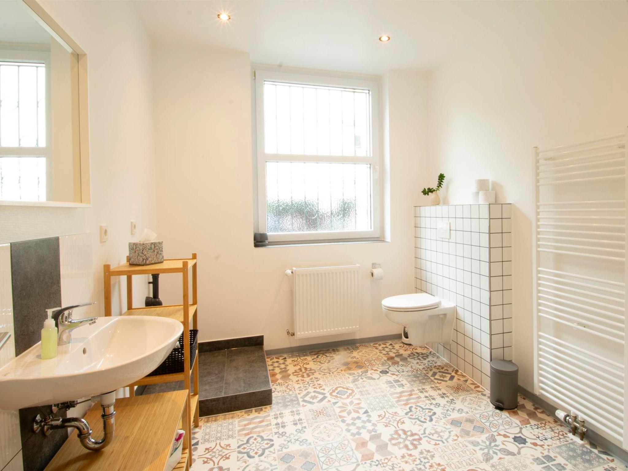 modernes Badezimmer mit Vorwand-WC, großem Fenster, Waschmaschine, Glasduschtüre