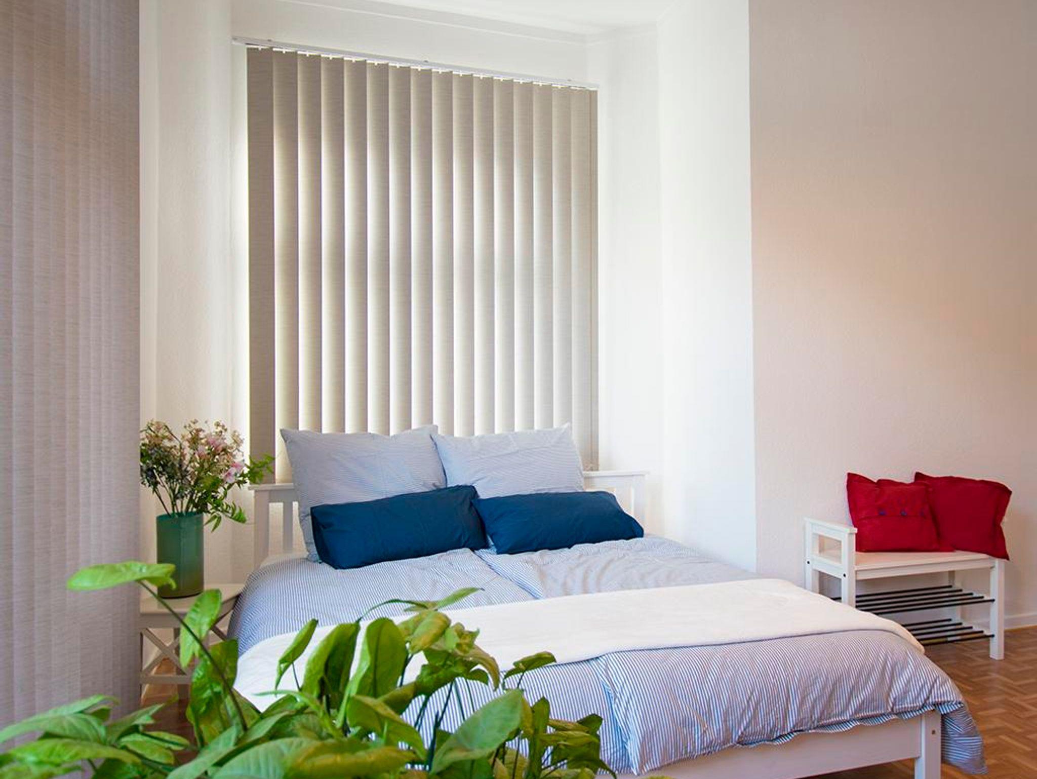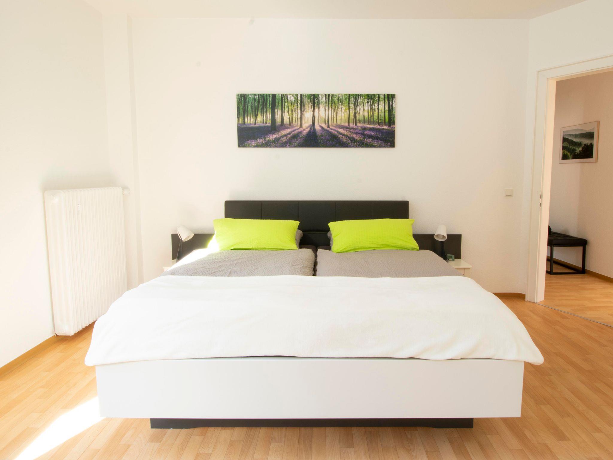 Schlafzimmer Clara-Viebig-Straße: großzügiger und heller Schlafraum mit 2-Türer-Kleiderschrank und 180×200 Doppelbett, Nachtischschränkchen und Beleuchtung, verdunkelbar durch Jalousie, Ausblick Richtung Therme und Hofeinfahrt/Straße