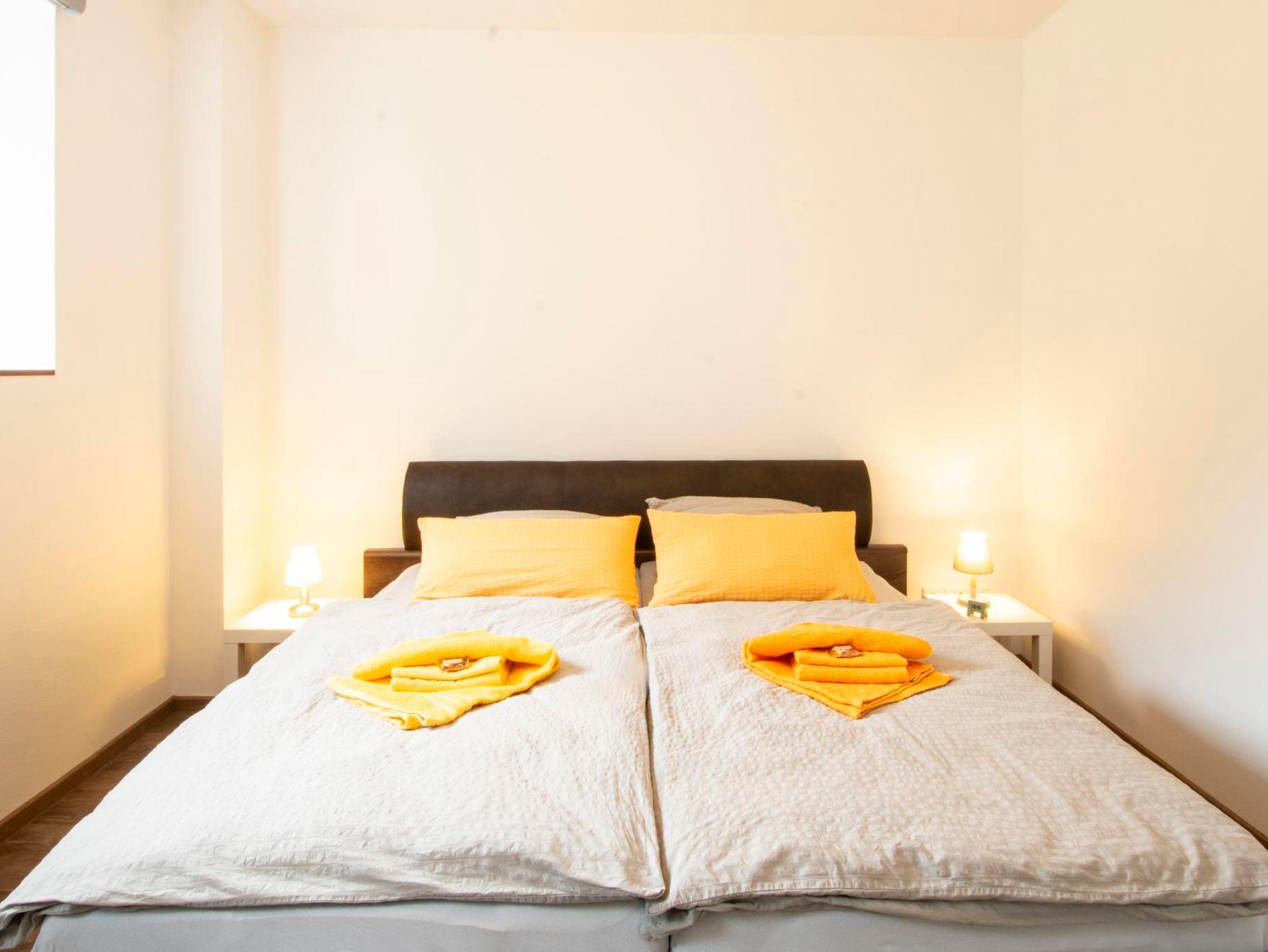 Schlafzimmer Bach: Schlafraum nach Norden mit 3-türigem Kleiderschrank, Stuhl, 180×200 Doppelbett mit Nachttischchen und Leselampen, Verdunklung durch Fensterrollos, Ausblick Richtung Wald und Bach, Touristinfo und Palmberg