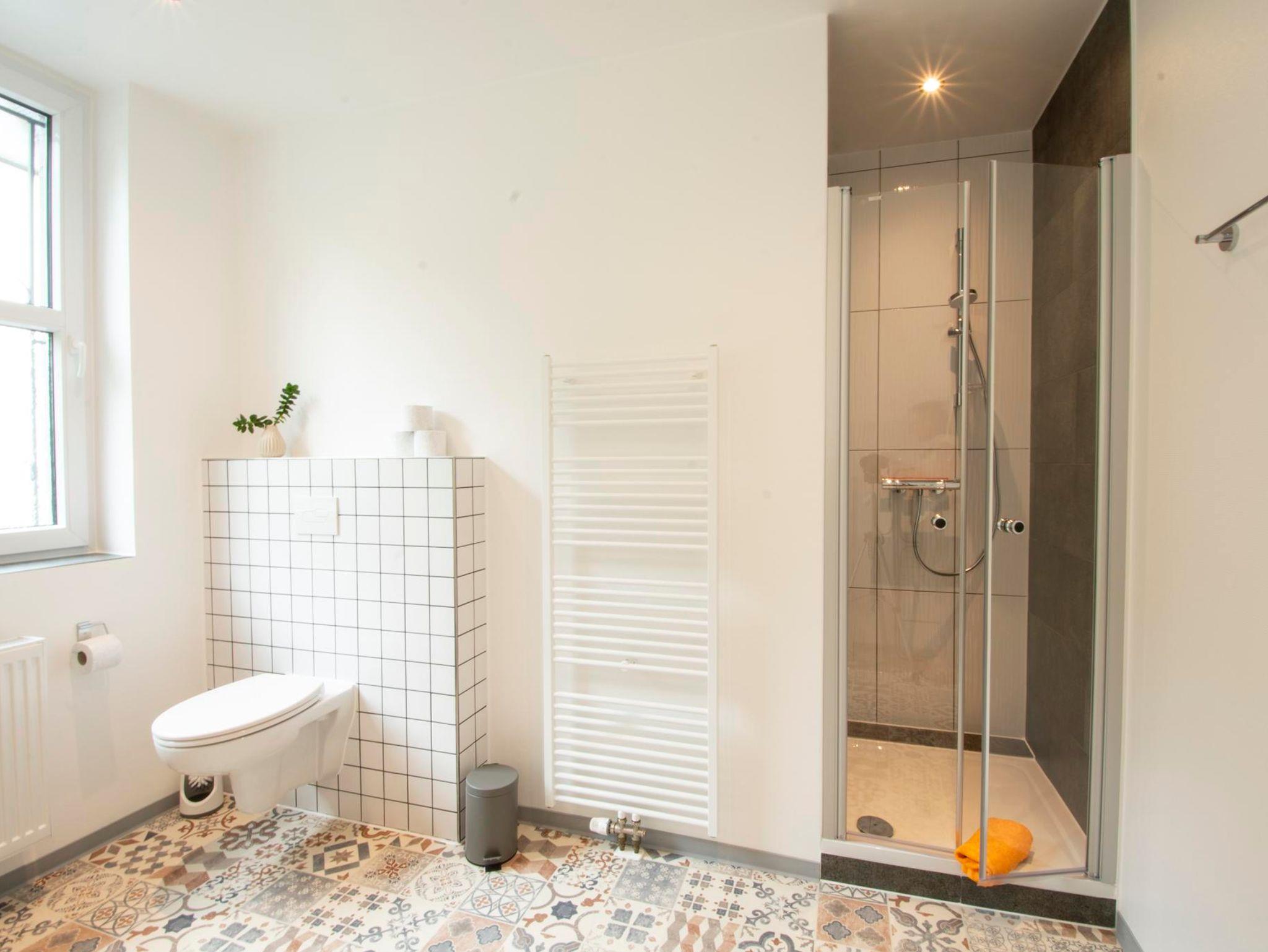 Badezimmer: helles und geräumiges Badezimmer mit großem Fenster zum Hof gelegen, gemauerter Dusche mit Glasduschtür, Vorwand-WC, Waschmaschiene und Wäscheständer