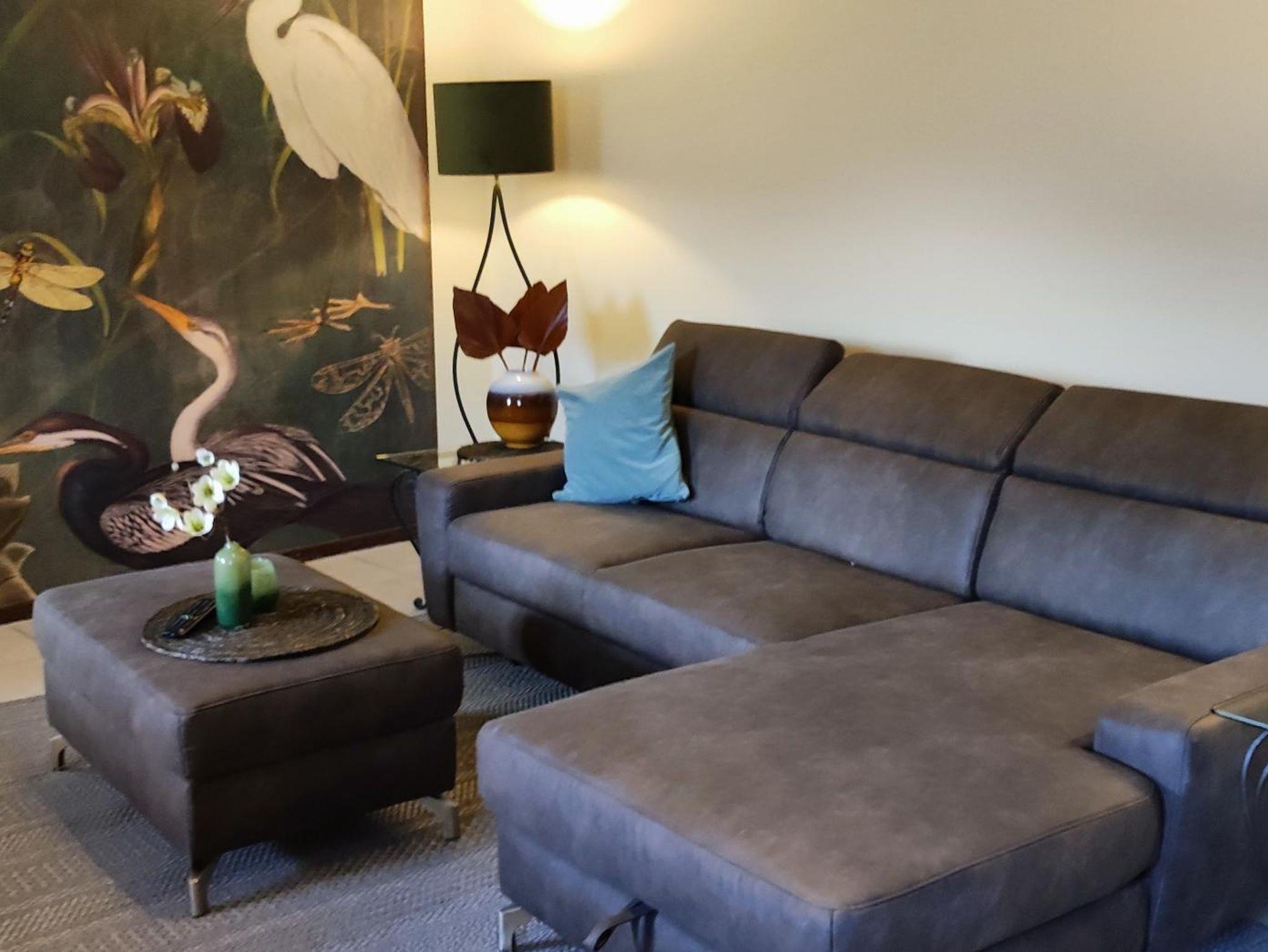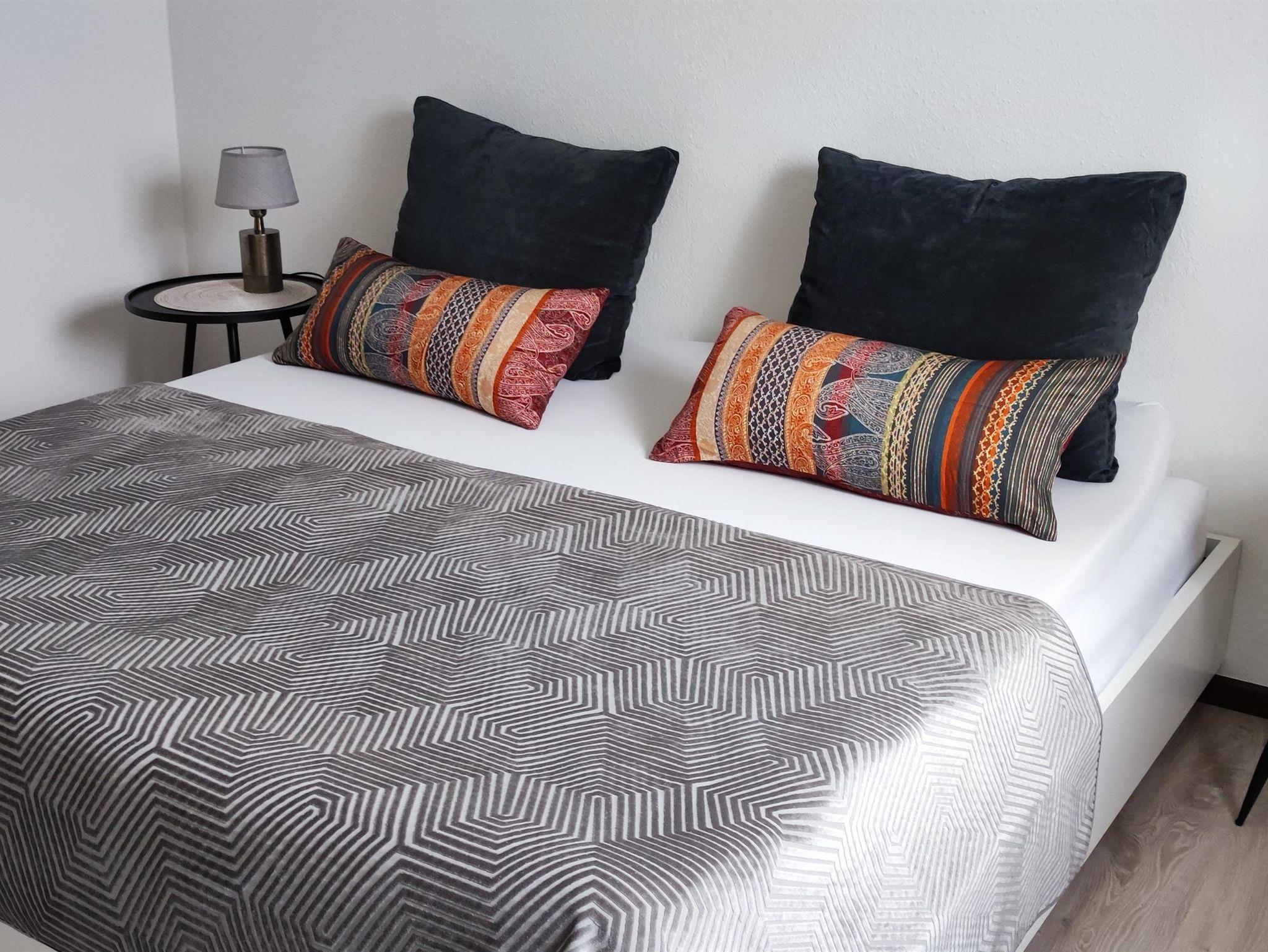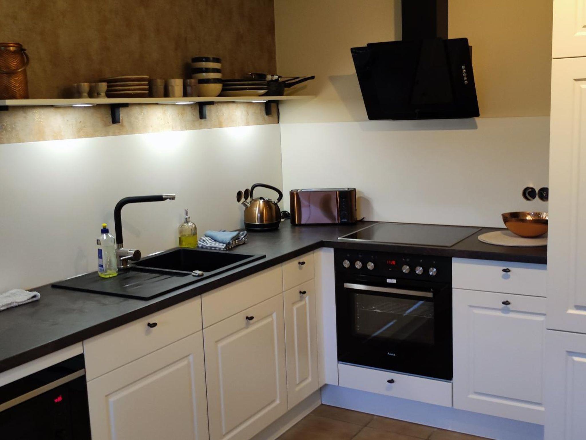 Die 60m² große Ferienwohnung liegt im Erdgeschoß. Das Wohnzimmer ist ausgestattet mit einer großen Schlafcouch, Beistelltischen und einem Sideboard, TV und Telefon. Das Schlafzimmer ist mit einem Doppelbett, Nachttischen, Schrank, Stühlen und Verdunklungsgardinen eingerichtet. Das Bad verfügt über eine begehbare Dusche, Waschbecken, WC und Fön, sowie div. Pflegeprodukte. Die neue Einbauküche mit Sitzecke verfügt über Spülmaschine, Mikrowelle, Kühlschrank mit Eisfach, Ceranfeld mit Backofen, Kaffeemaschine, Toaster und Wasserkocher. Vor der Wohnung befindet sich eine Terrasse, die über das Treppenhaus erreichbar ist.