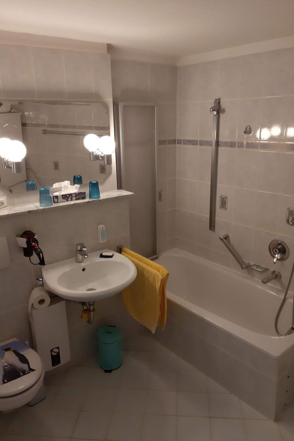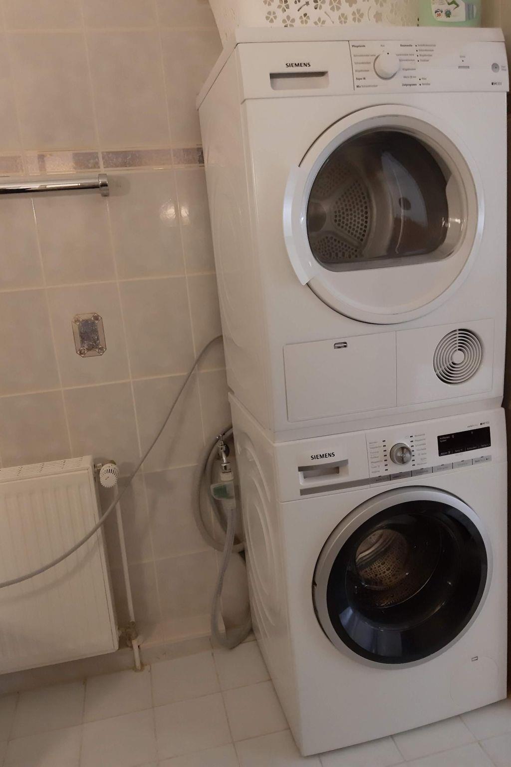 The bathroom consists of a washbasin, WC, bathtub with shower, washing machine and tumble dryer