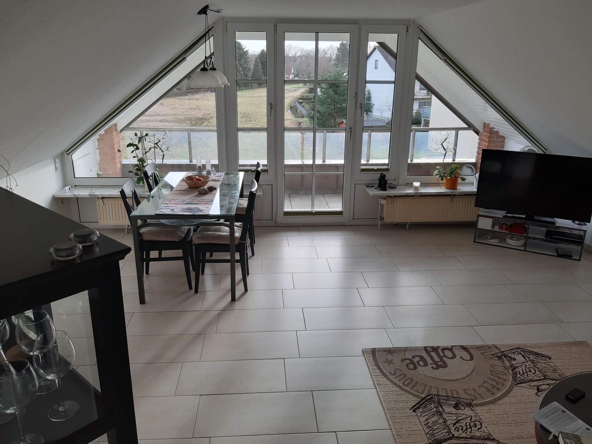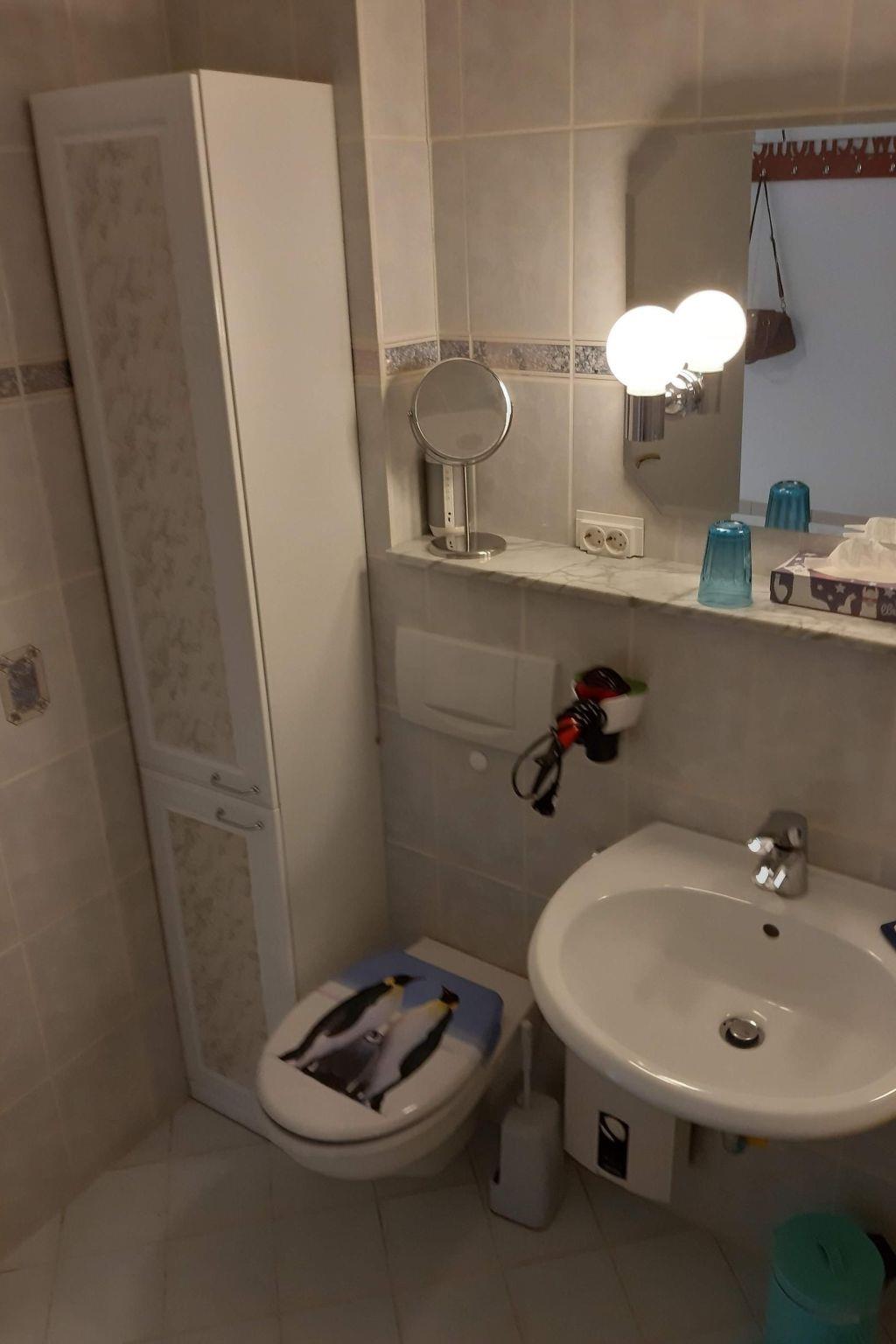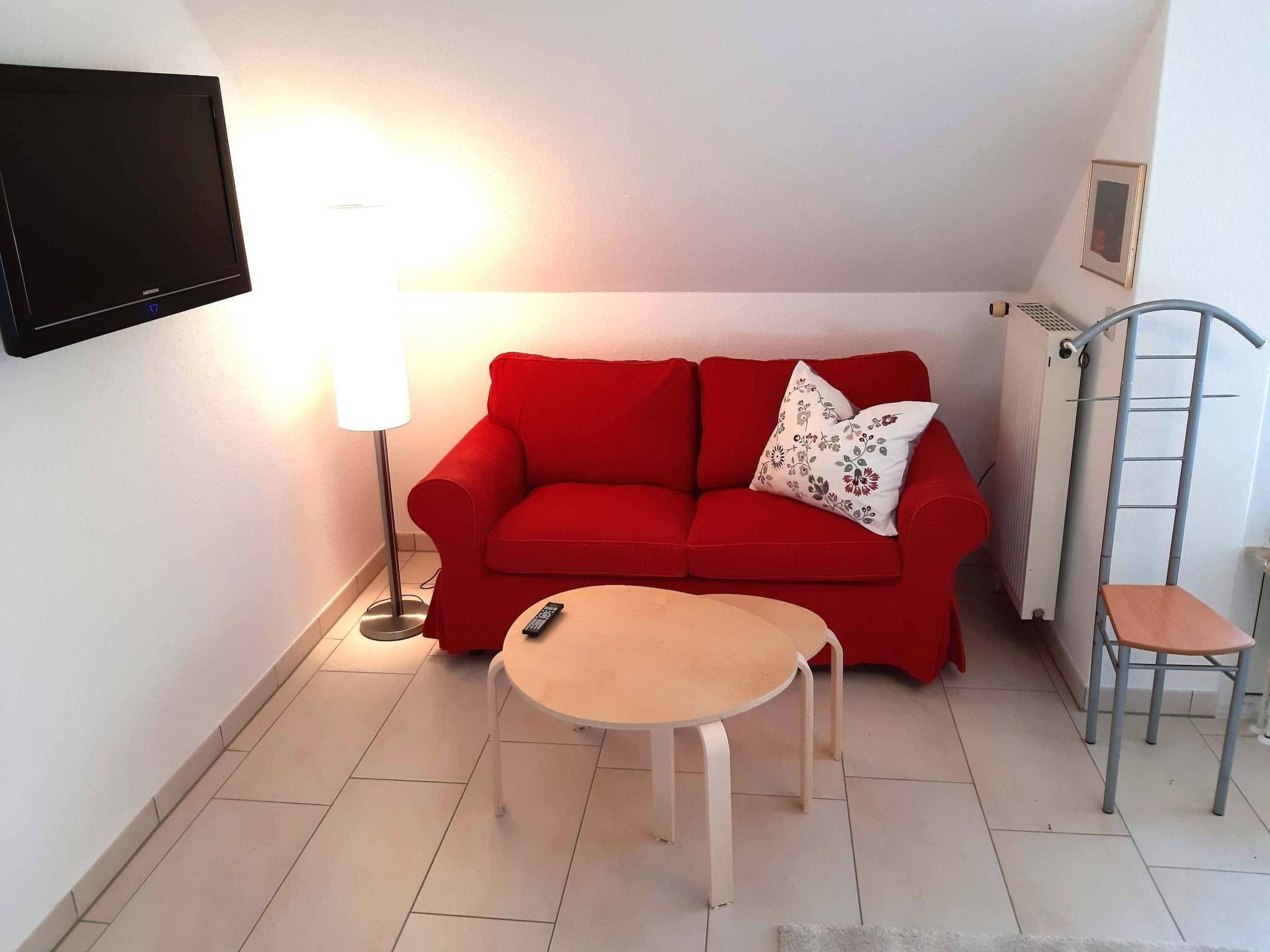 From there you enter the bathroom on the left and then directly into the living room with many other pieces of furniture to make your stay pleasant and comfortable. This includes the 52" flatscreen TV with amazon prime. From there, you can also access the spacious, covered balcony (125 x 540 cm) facing east and the Eckermannwiese with comfortable garden furniture.