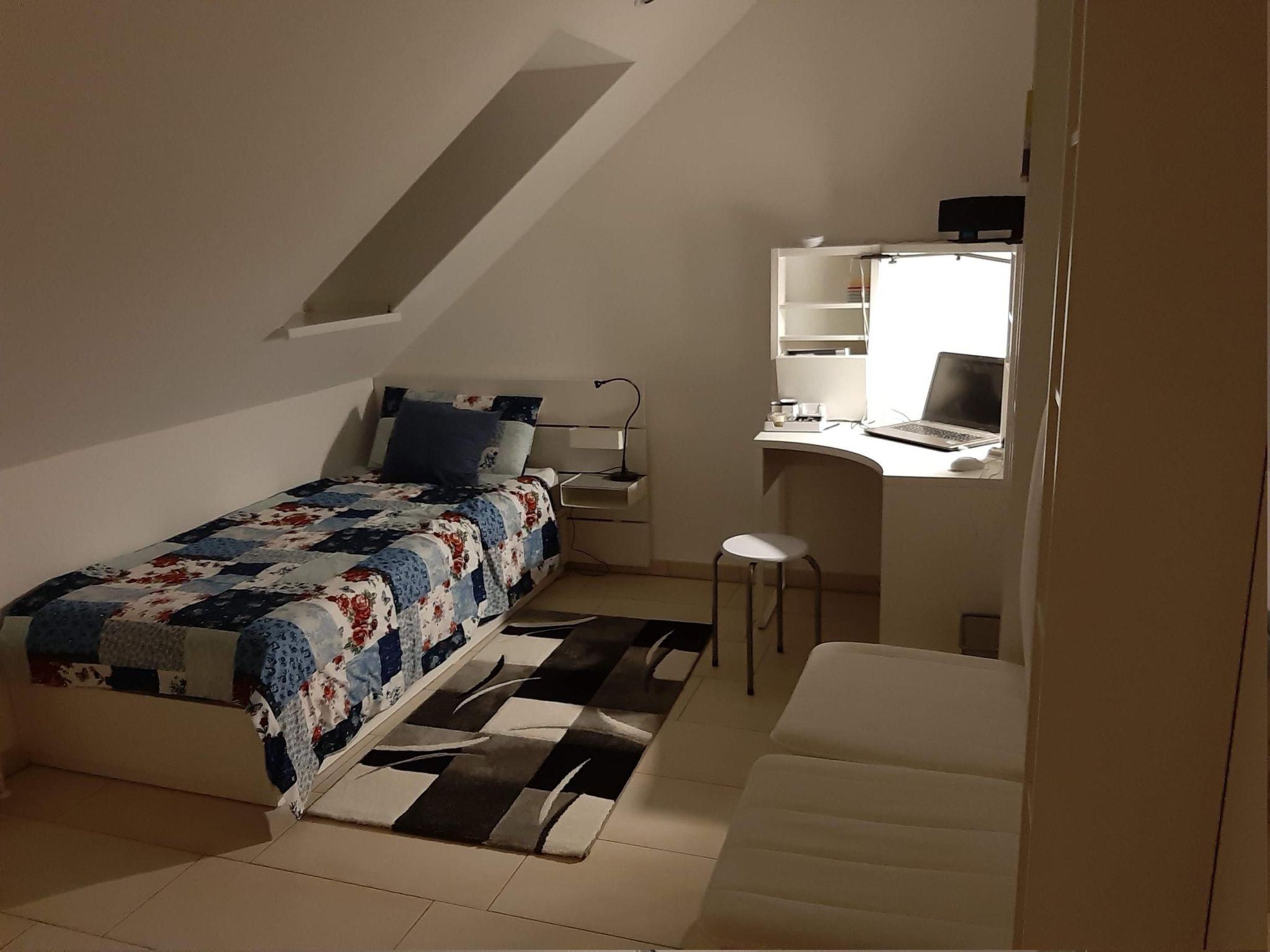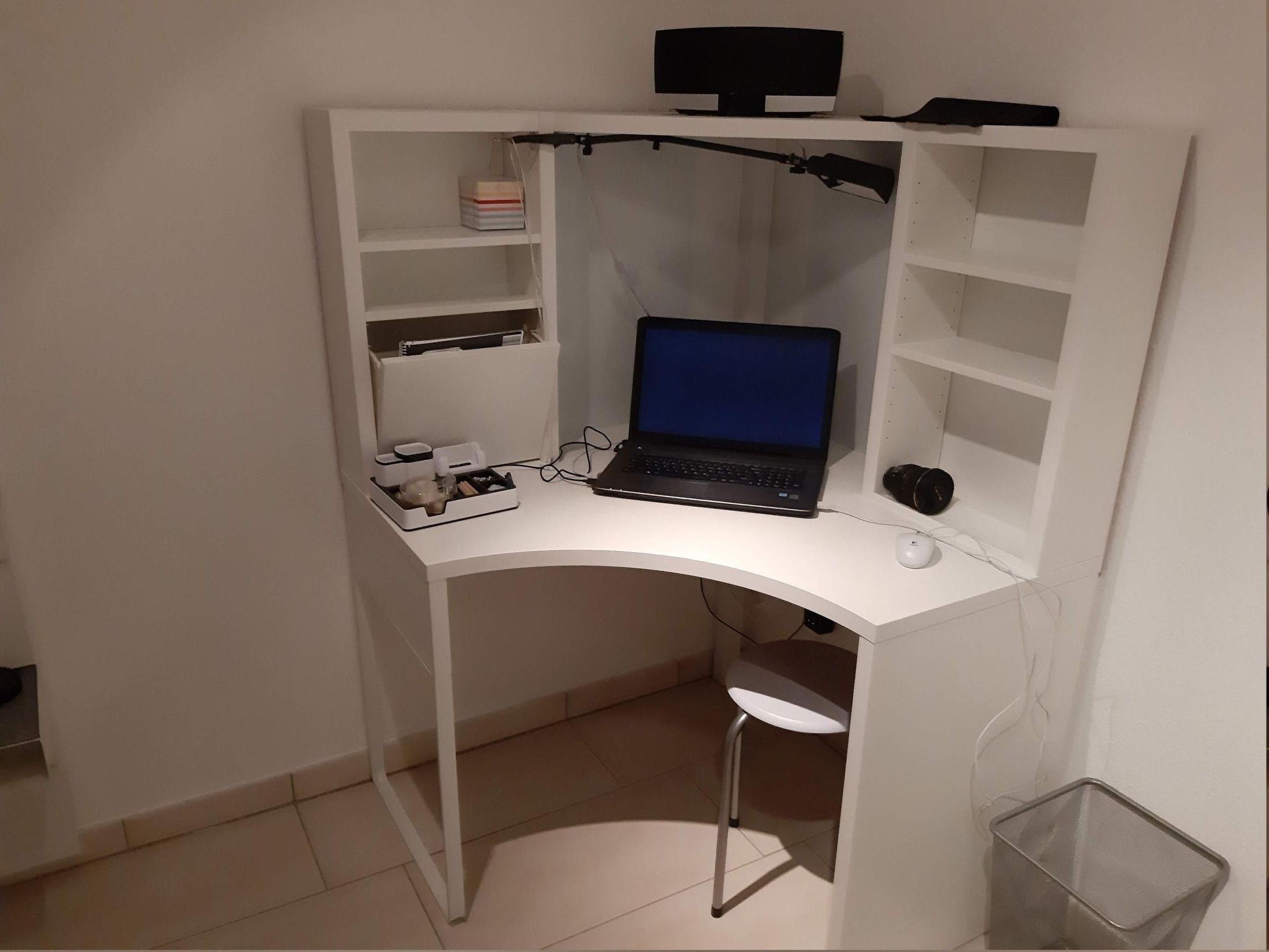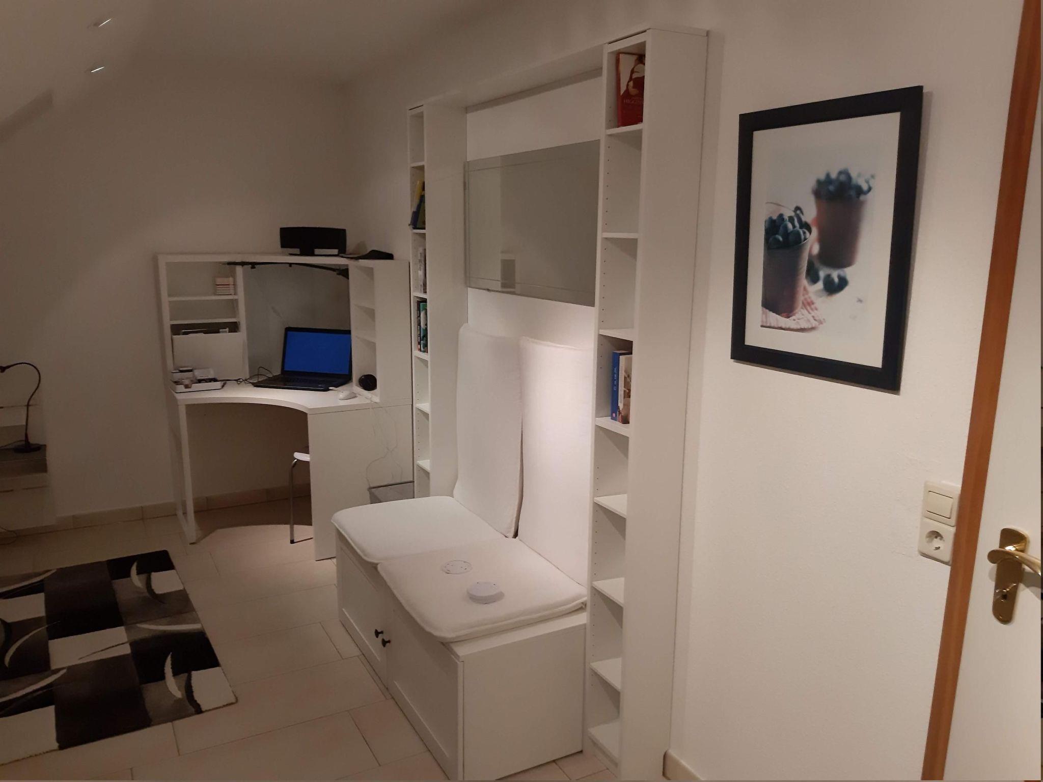 Next to the bedroom and opposite the kitchen is the second bedroom/office. There you will find two single beds 80 x 200 with open foot end, a small reading corner and a desk with netbook, lan connection, screen, keyboard and mouse. Here you can surf the Internet endlessly and securely. However, WLan / Wifi is also available free of charge throughout the flat.