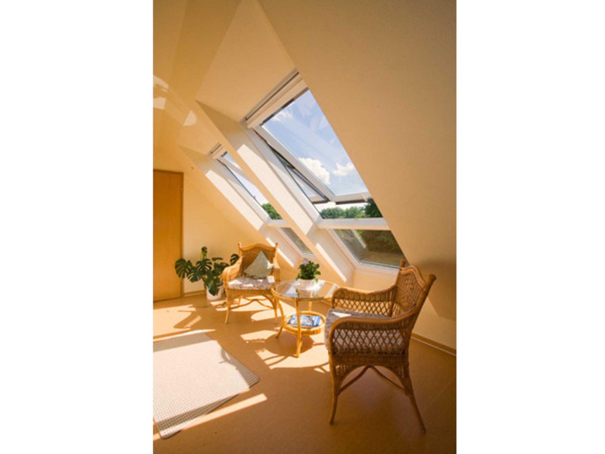 • 1 kleiner Raum mit großen, schrägen Fenstern und Sitzgelegenheiten,
