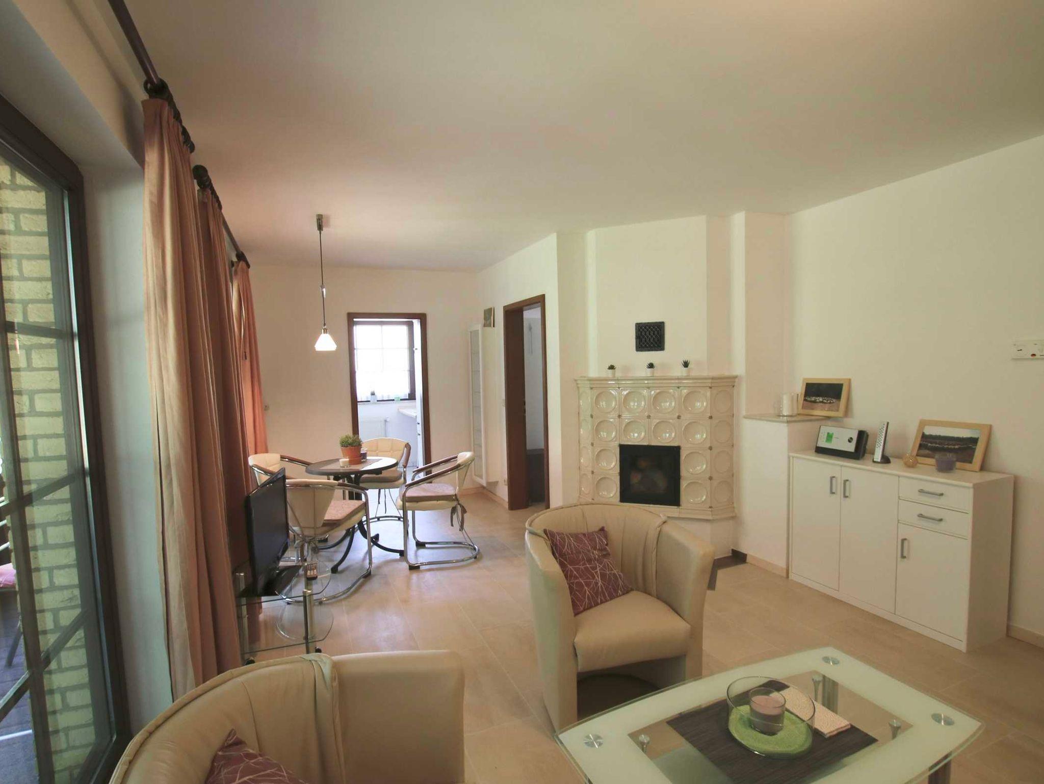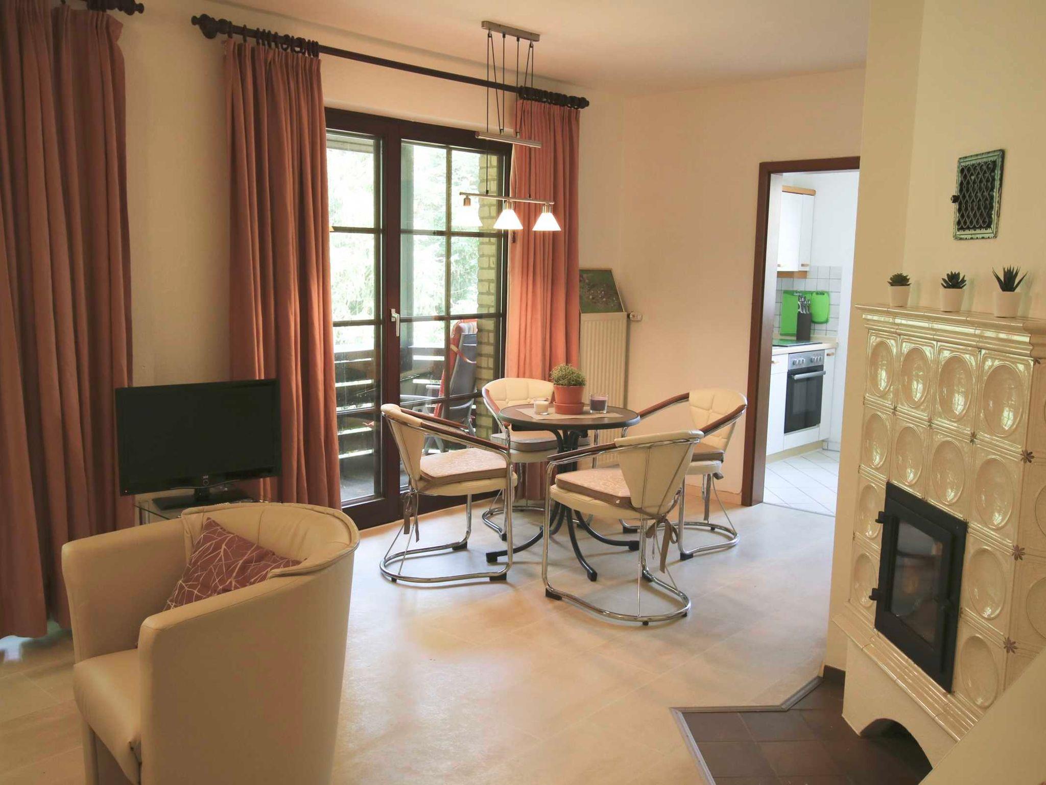 • 1 Wohnraum mit Sofa und Flat-TV, Essplatz und Kachelofen,