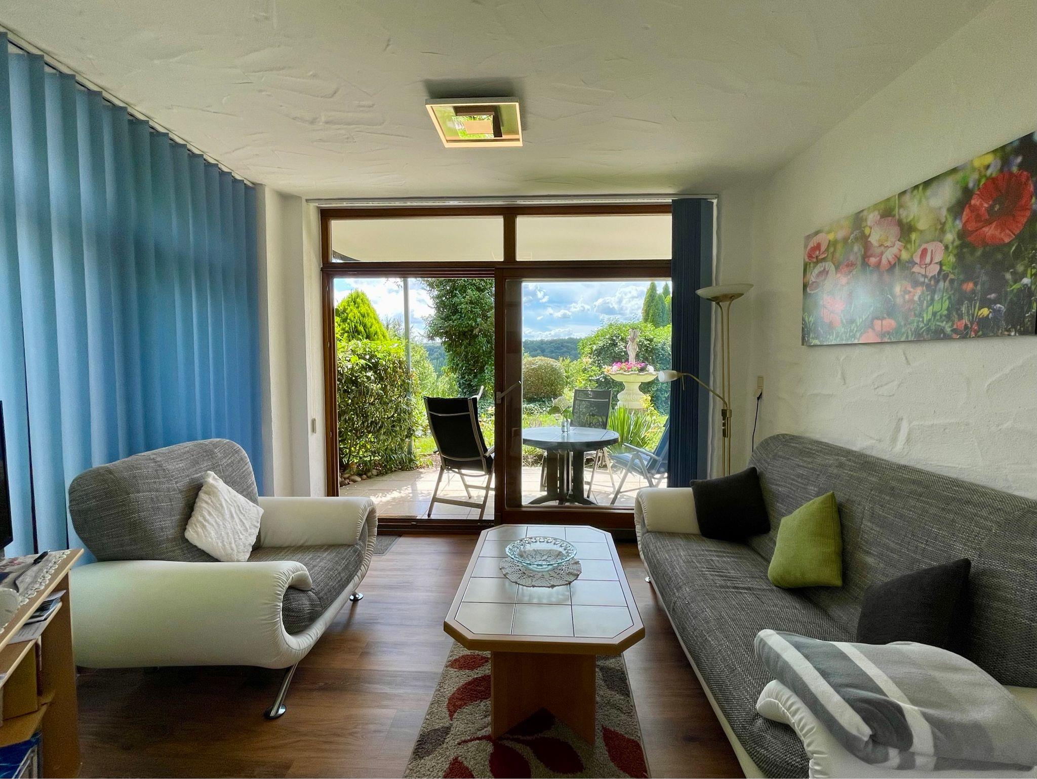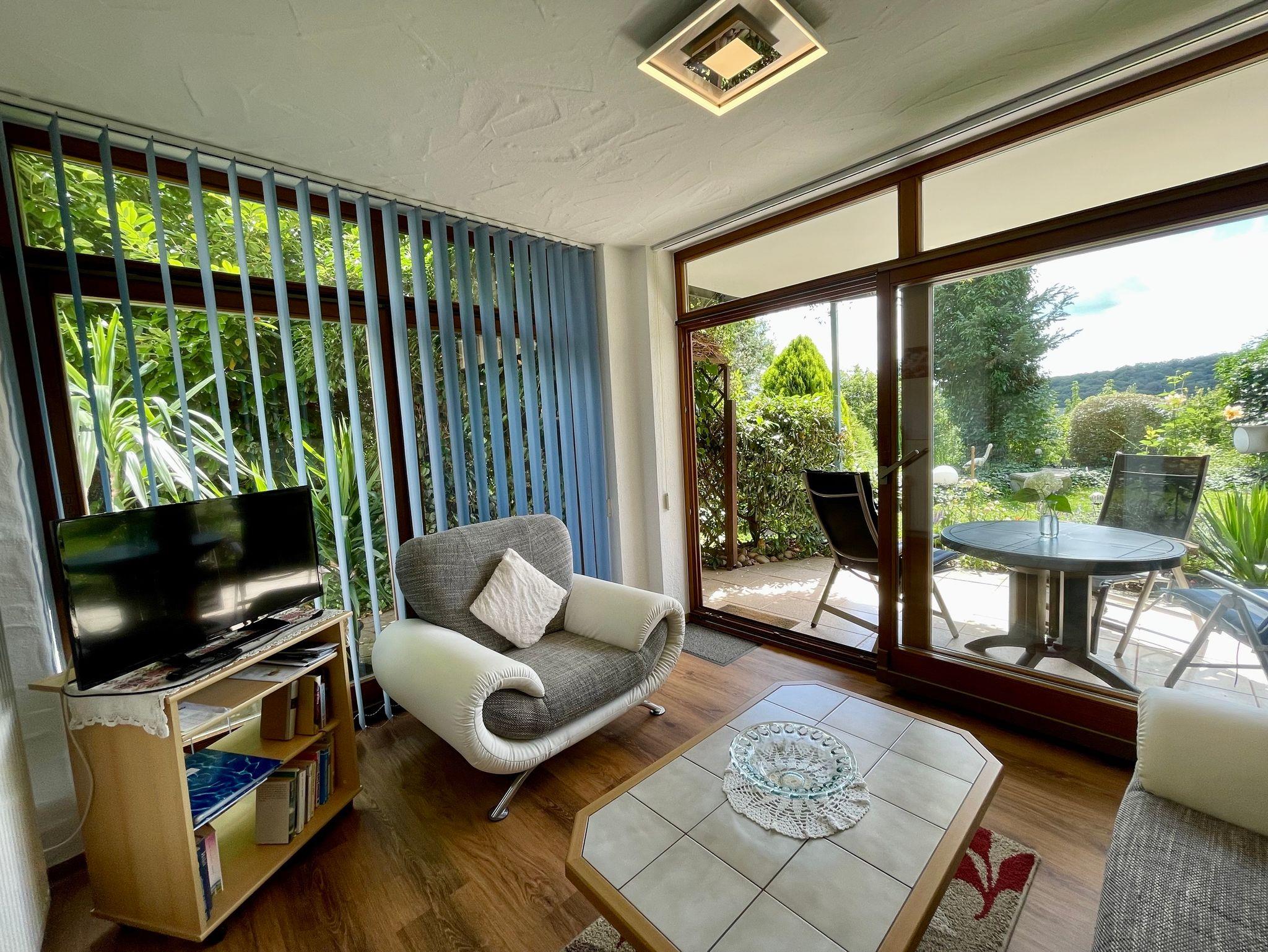 Das Wohnzimmer befindet sich im Wintergarten mit direkten Zugang zur überdachten Südterrasse, bequeme Couch + Sessel, Flachbildschirm-TV, Radio/ CD-Player, Wohnküche mit Essecke und Schlafcouch für 2 Personen, Kühlschrank, ausreichend Küchenutensilien, Herd, Backofen....., DU/WC, DU mit Haltegriff, Duschmatte + Duschhocker, Fön.
