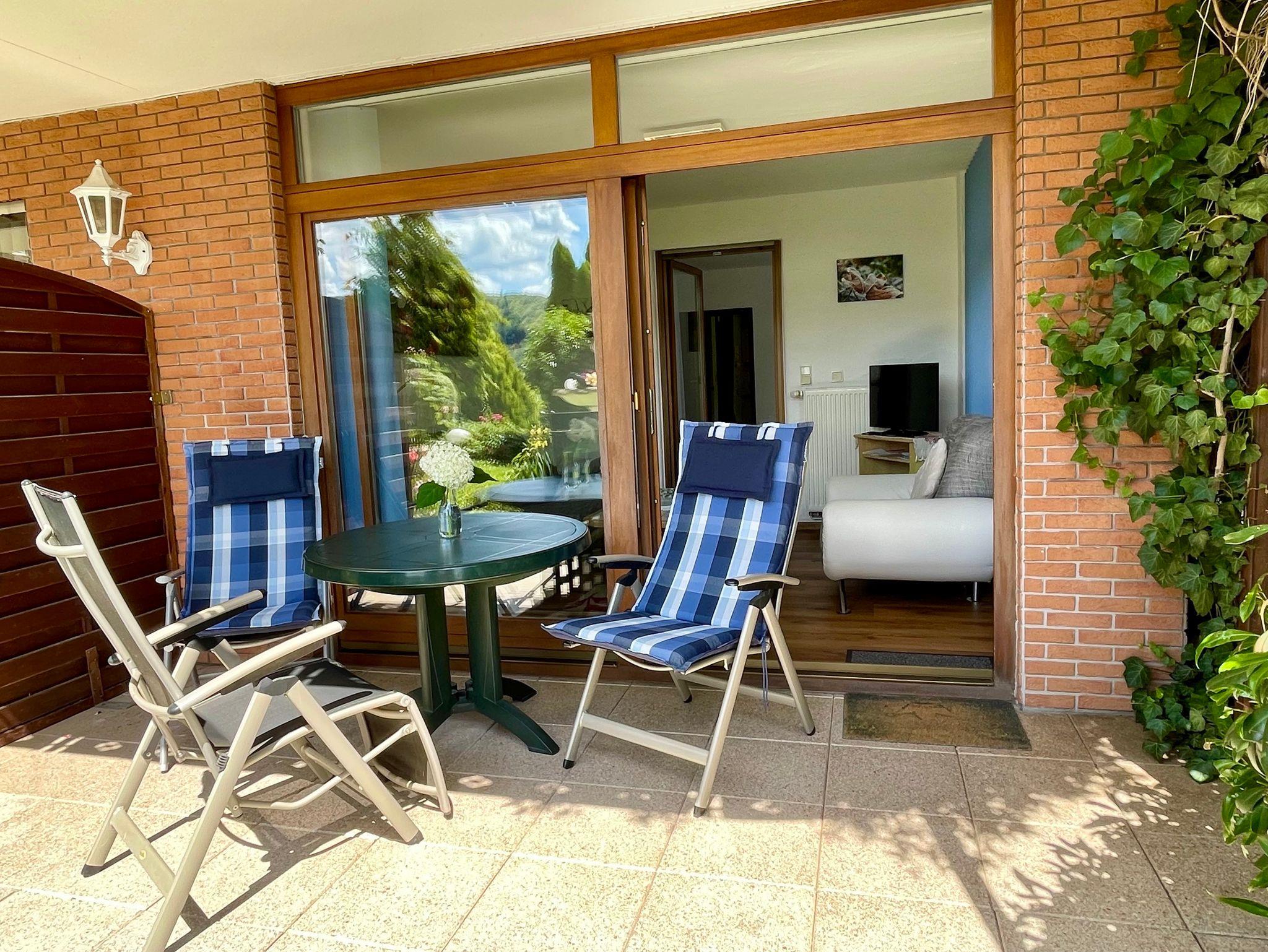 Erdgeschosswohnung - 60qm mit überdachter Südterrasse und direkten Zugang zur Liegewiese, Garten und Parkplätzen.