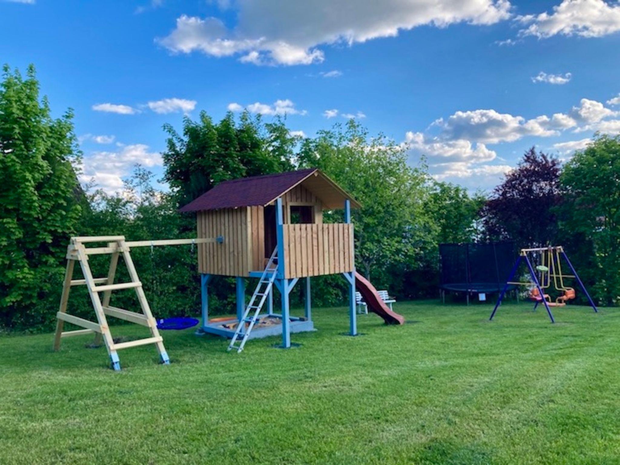* im unteren Garten, großer Spielplatz mit verschiedenen Spielgeräten wie Riesentrampolin, Rutsche,