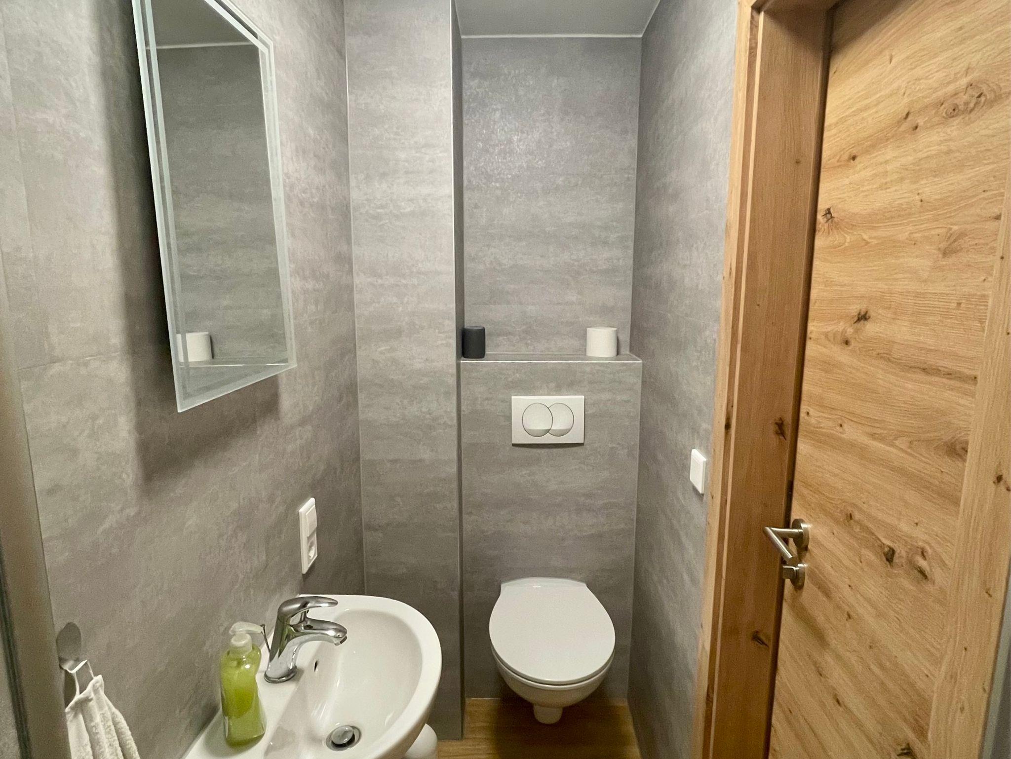 Das Badezimmer verfügt über eine Dusche, ein WC, ein kleines Waschbecken sowie einen Föhn.