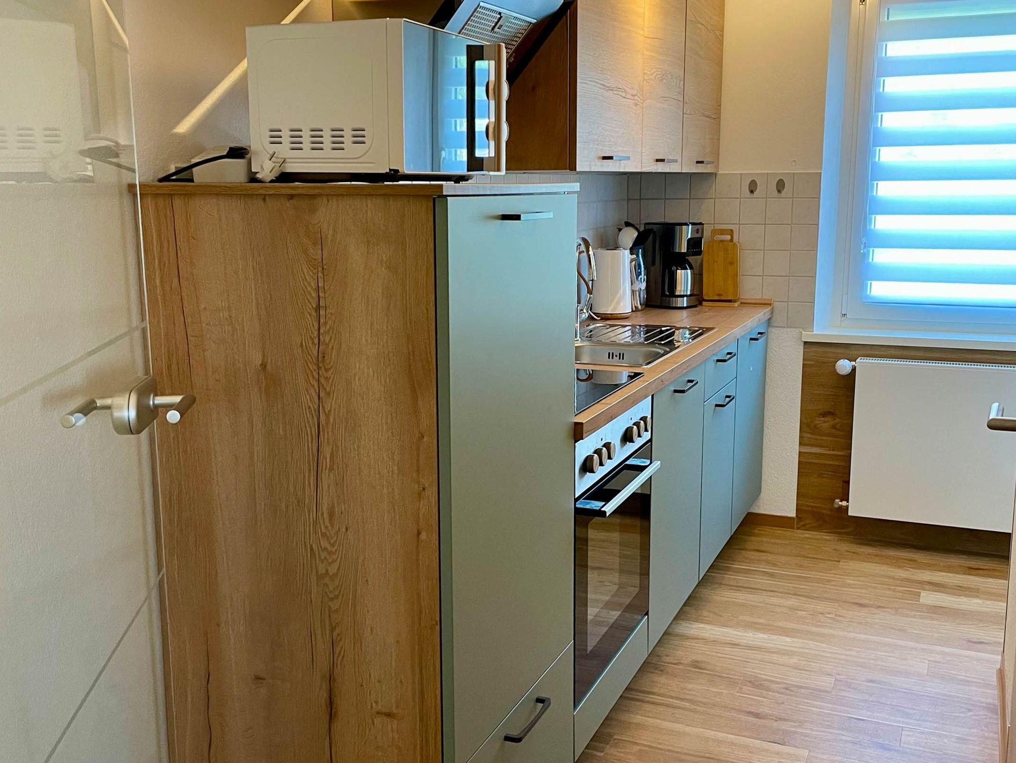 In der voll ausgestatteten Einbauküche finden Sie alles, was Sie zum Kochen benötigen: Kühlschrank mit Gefrierfach, Cerankochfeld mit Dunstabzug, Backofen, Mikrowelle, Toaster, Wasserkocher, Eierkocher, Kaffeemaschine sowie ausreichend Geschirr, Gläser, Besteck und Kochutensilien.
