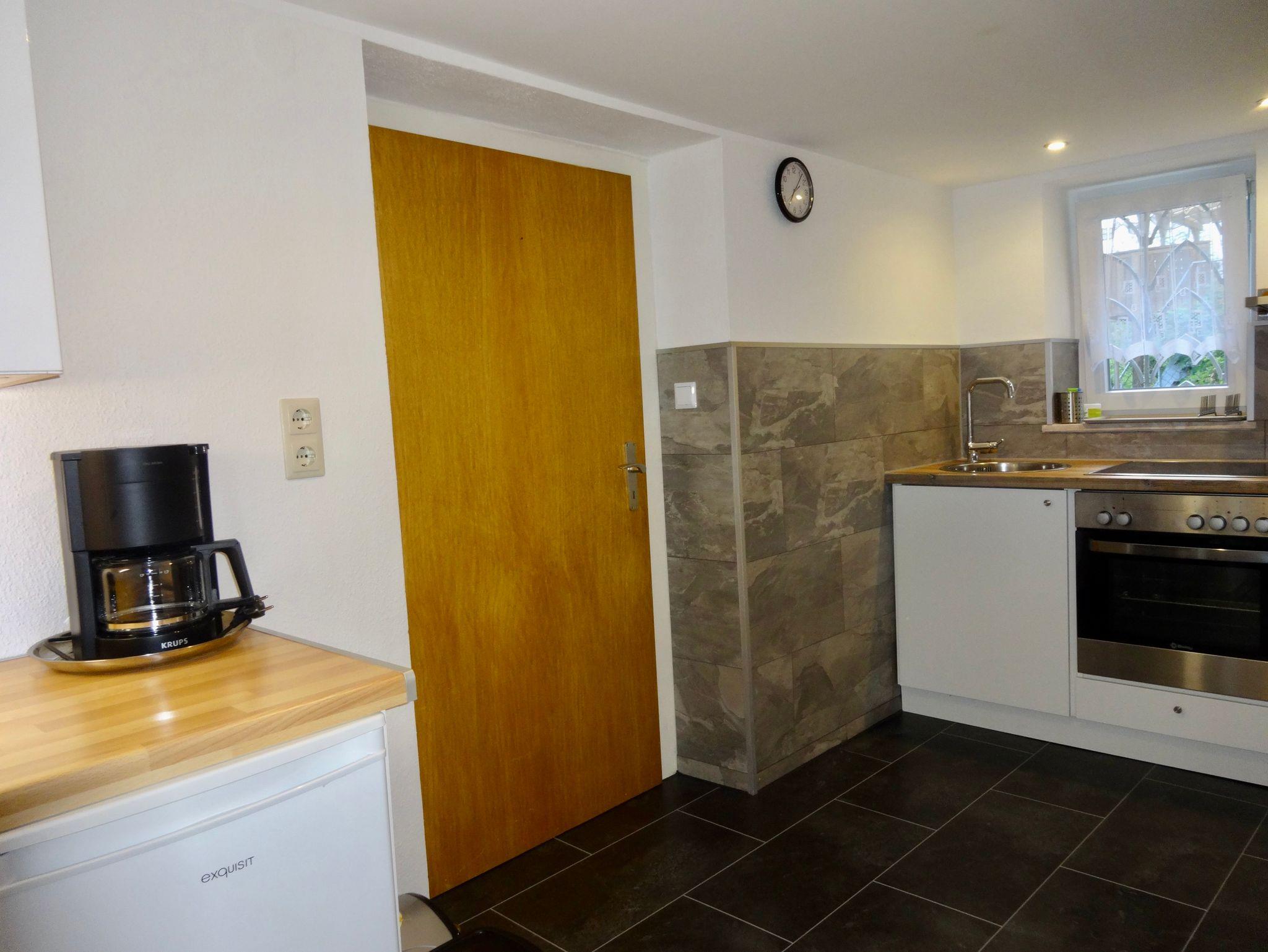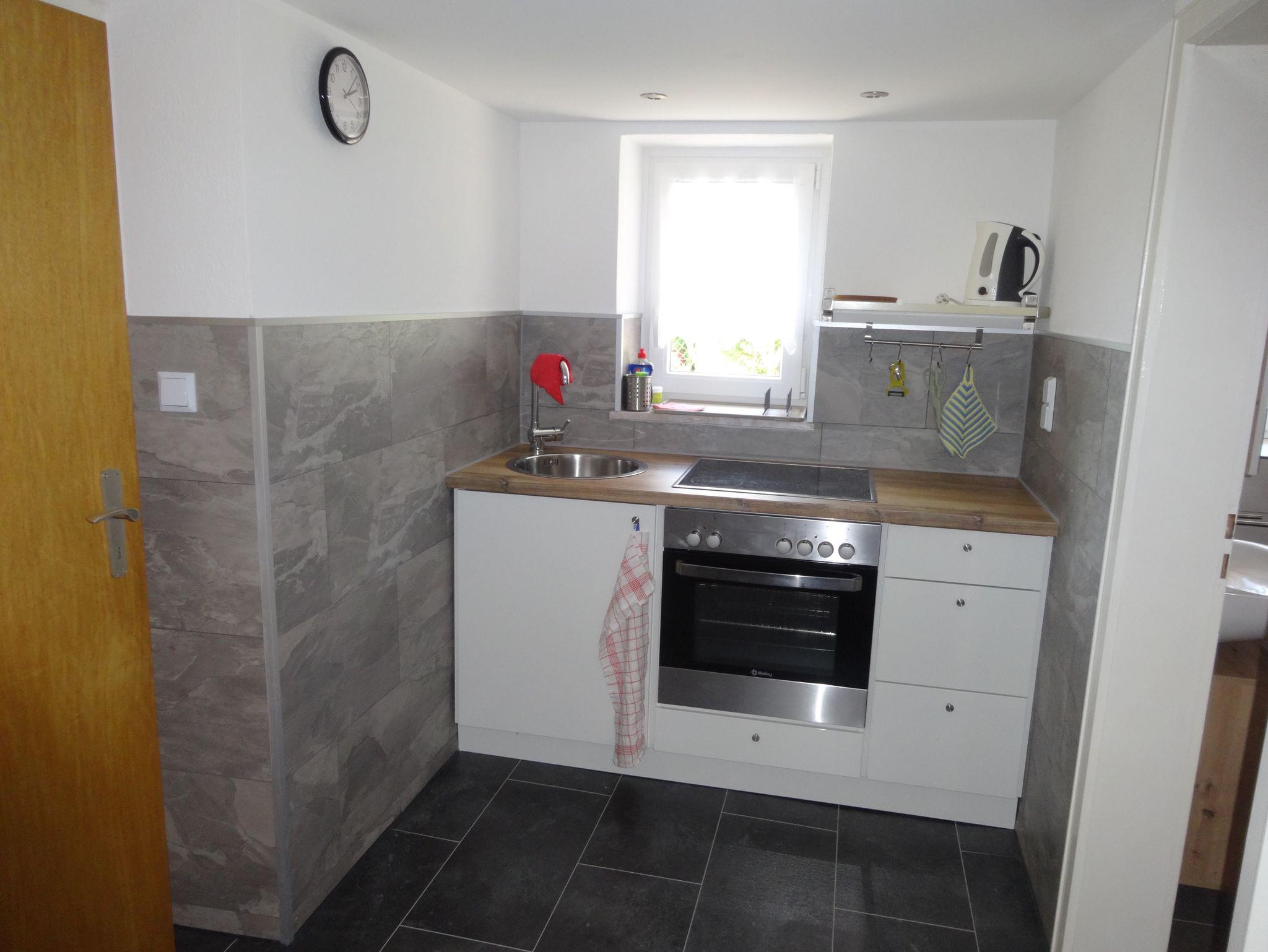Die Küche ist voll ausgestattet mit Ceranfeld und Backofen, Kaffeemaschine, Wasserkocher und Toaster und Kühlschrank.