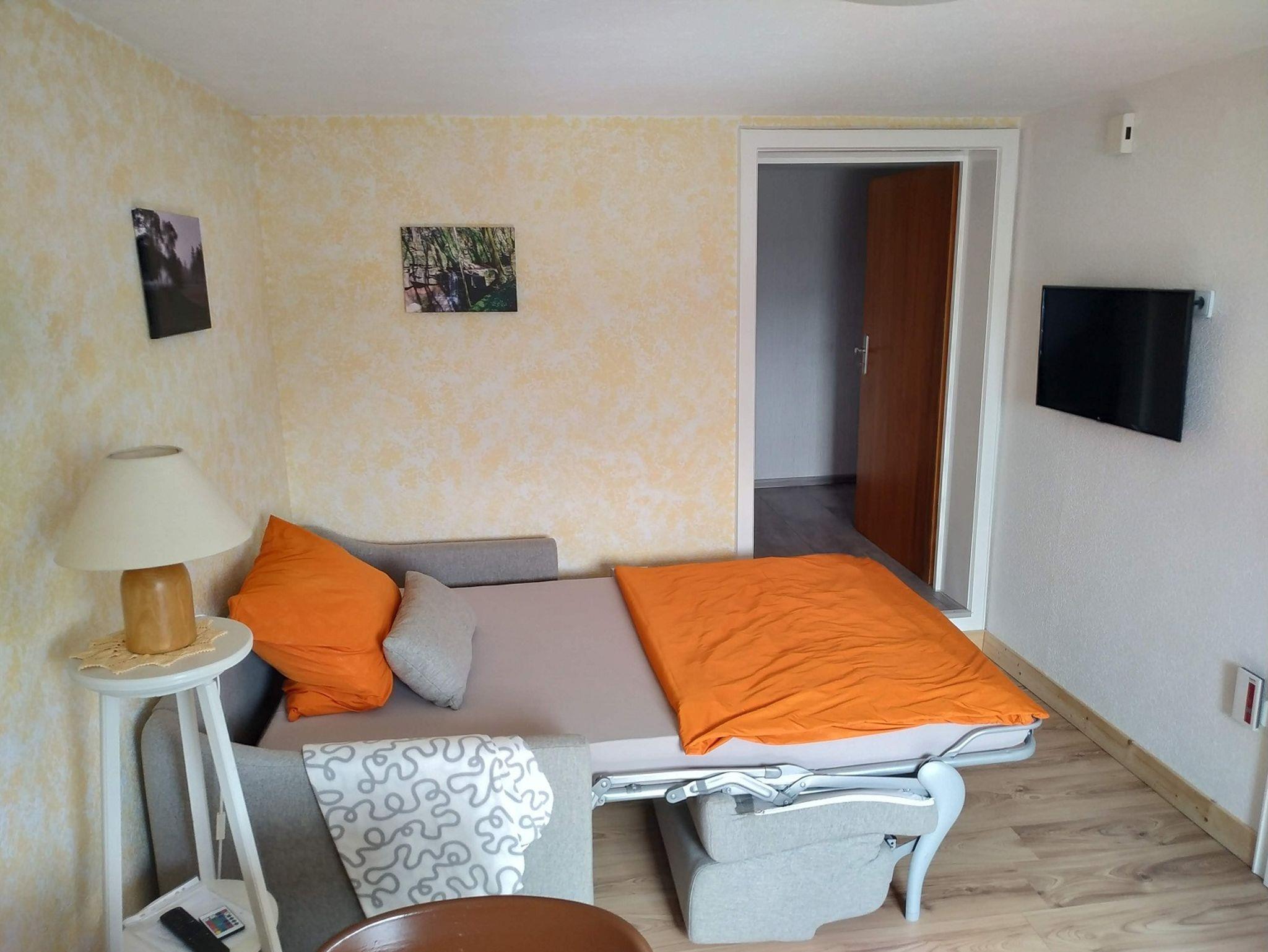 Ausstattung: französisches Bett (2 Matratzen) 160x200, Kleiderschrank, Klappsofa (ausklappbar 120x200), Smart TV, WLAN