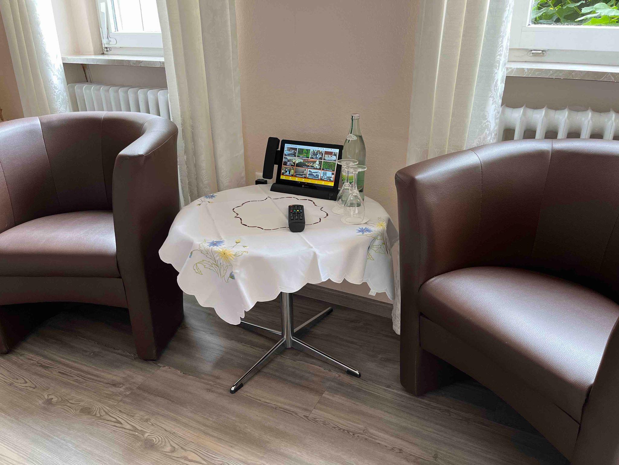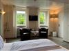 Im Zimmer befindet sich eine Sitzecke und ein Kleiderschrank bzw eine Garderobe.