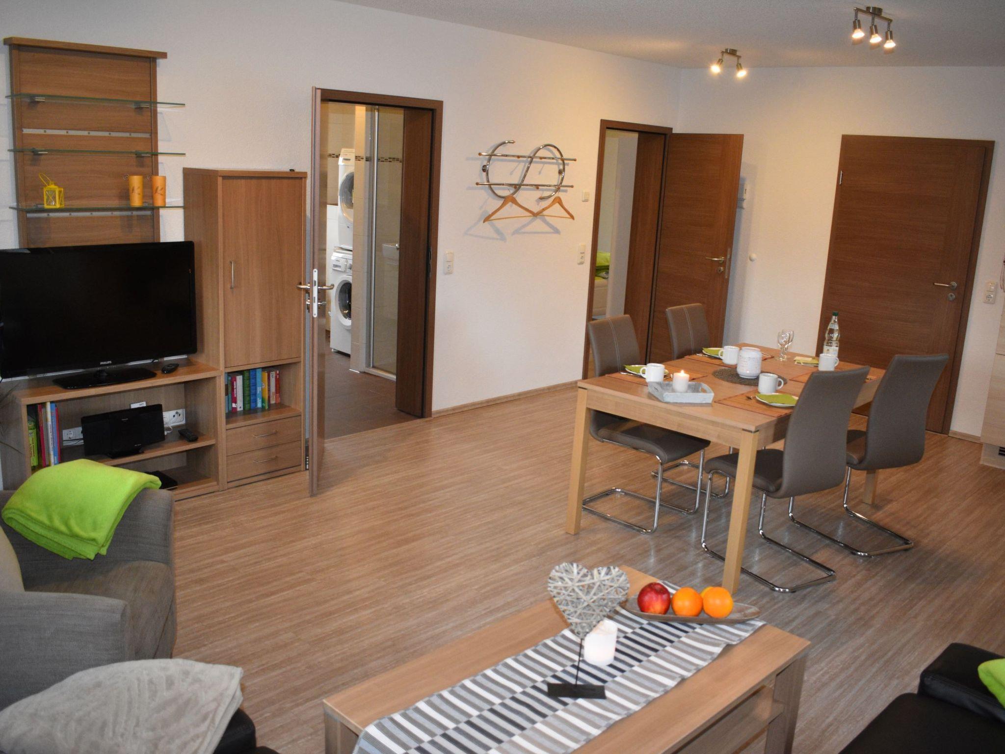 A spacious living room awaits you in our holiday flat, which leaves nothing to be desired with its fully equipped fitted kitchen. Here you can cook and enjoy to your heart's content. The cosy living area invites you to relax, while the 40" flat screen with DVD player and the radio-CD system provide entertainment. A restful night's sleep awaits you in the two separate bedrooms, each with a double bed and high-quality mattresses. The beds are made, and a high chair and travel cot are also available. The modern bathroom has a barrier-free shower, a towel radiator, plenty of storage space, a hairdryer, toilet, hand and shower towels as well as a washing machine and tumble dryer.