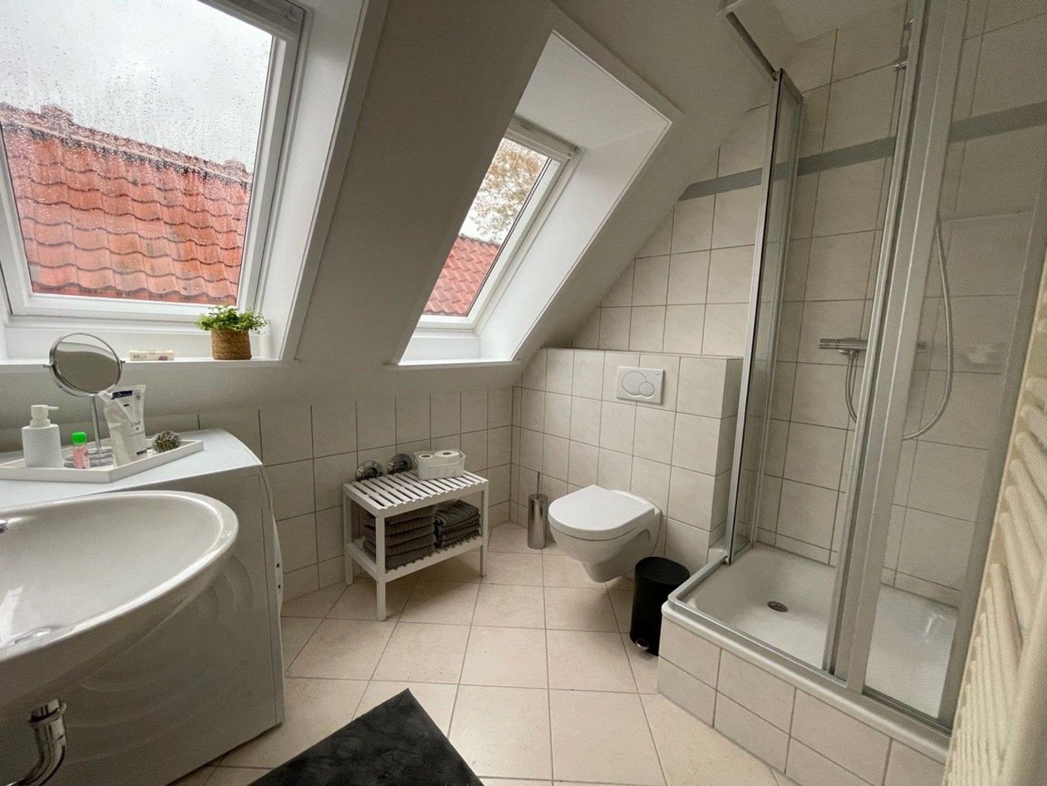Das moderne Badezimmer verfügt unter anderem über Waschbecken, WC, Dusche und eine Waschmaschine. Außerdem stellt der Gastgeber frische Seifen bereit.