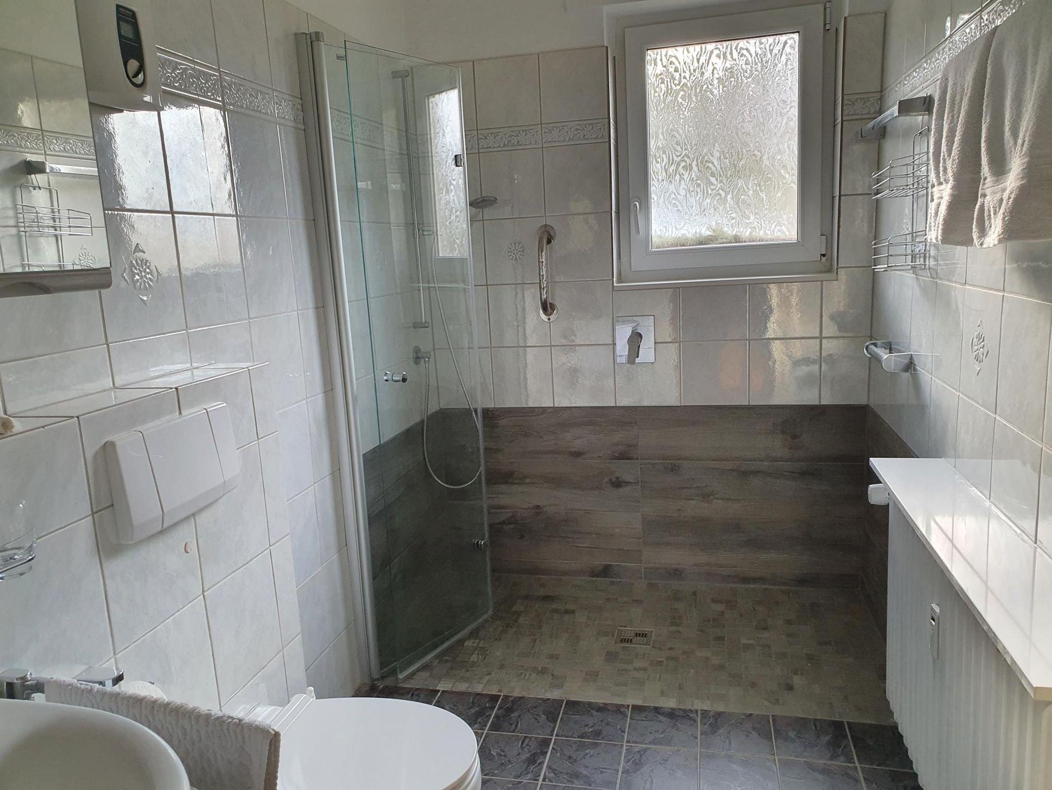 Das Badezimmer verfügt über eine bodentiefe Dusche und WC. Ein weiteres, separates WC ist zusätzlich vorhanden.