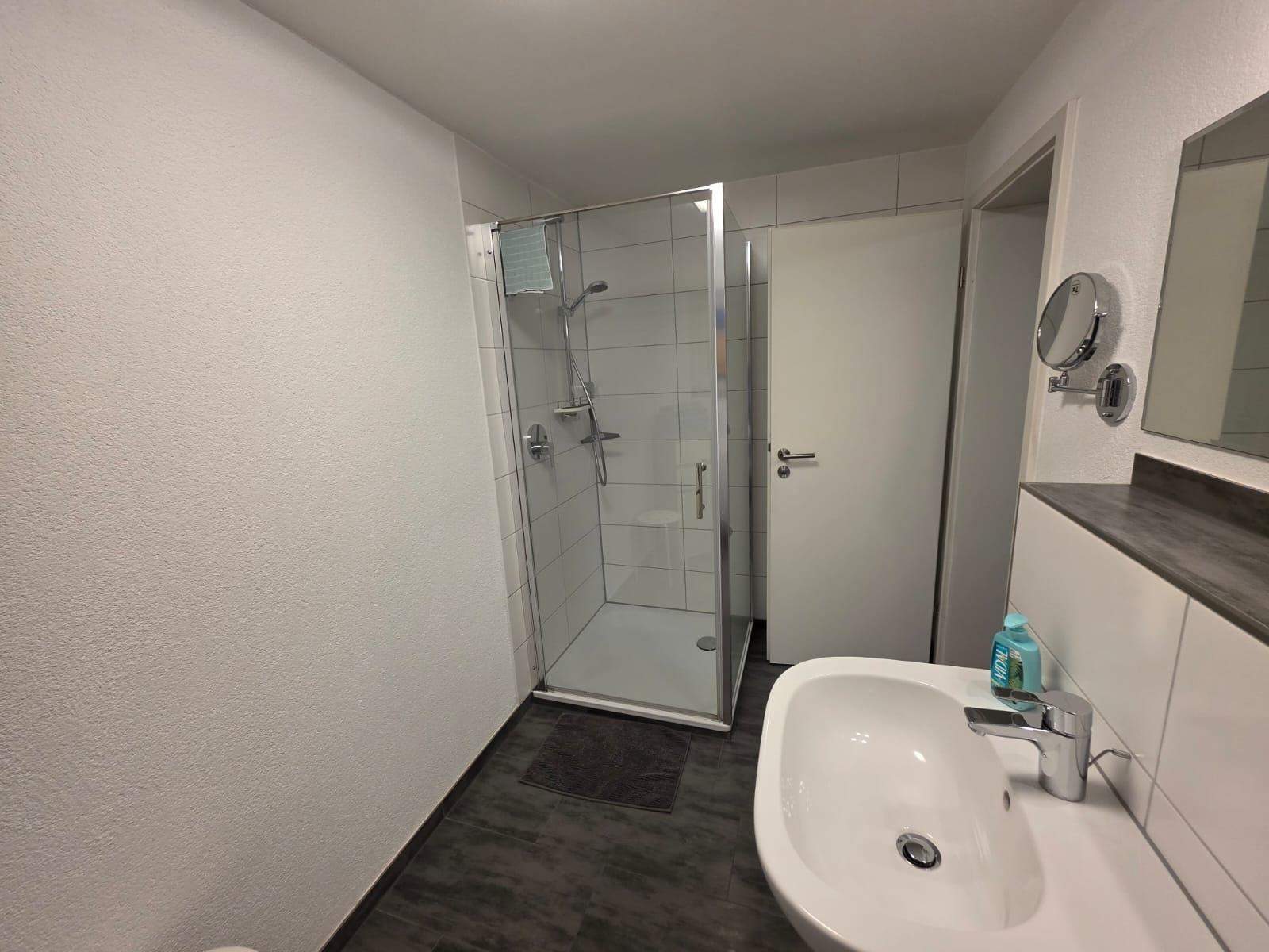 Das moderne Bad bietet eine großzügige Dusche, viel Ablagefläche und frische Handtücher.
