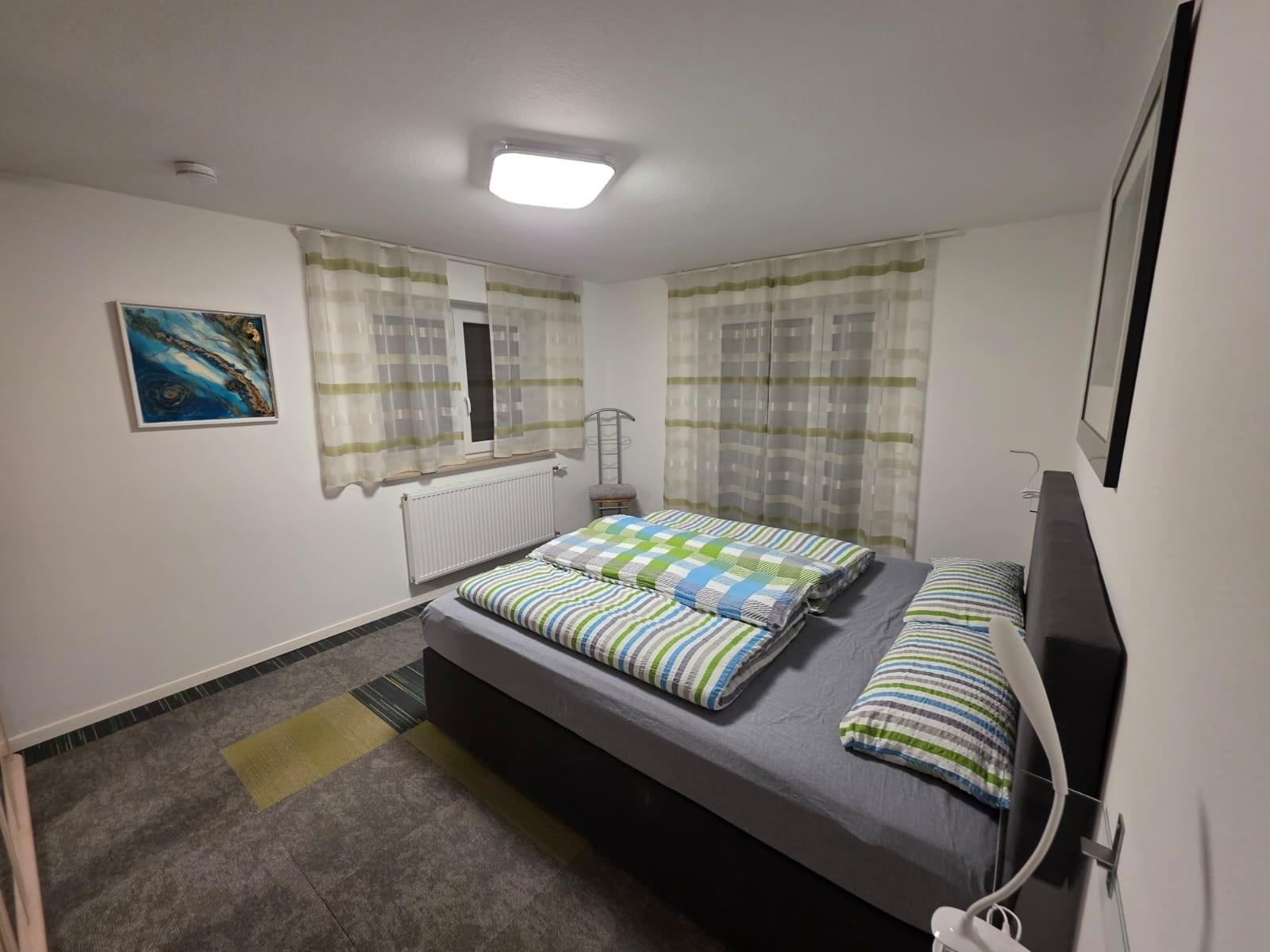 Das ruhige Schlafzimmer verfügt über ein bequemes Doppelbett, hochwertige Bettwäsche und viel Stauraum für einen angenehmen Aufenthalt.
