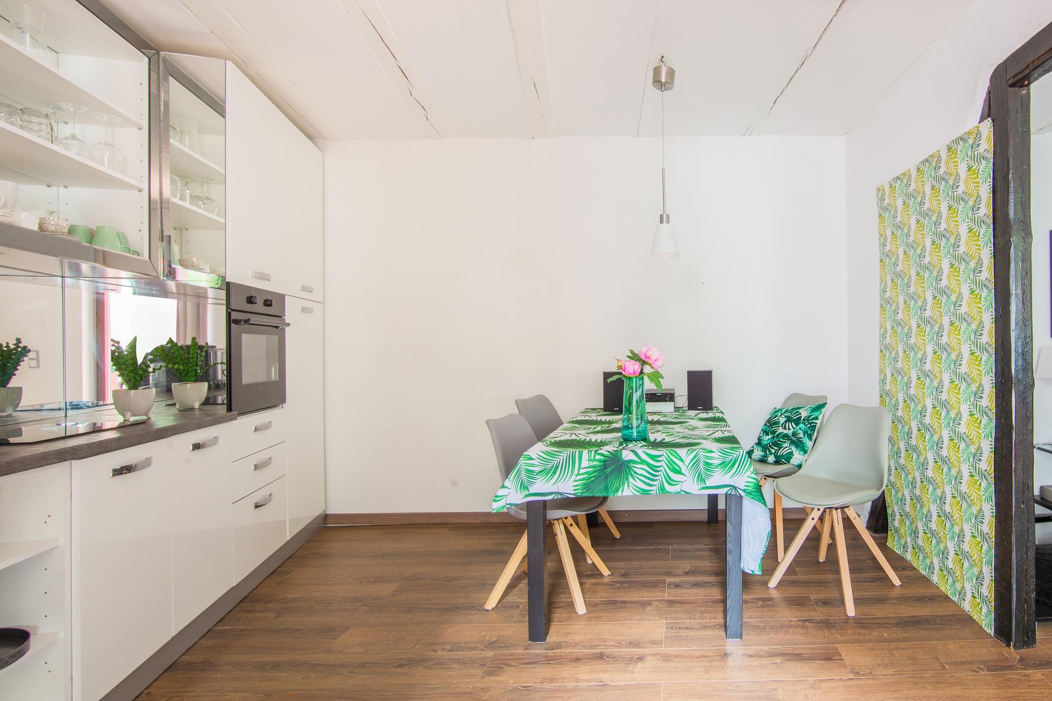 Denne elegante to-etagers maisonette i hjertet af Taunus-regionen blander moderne komfort med landlig charme, hvilket gør den til et perfekt tilflugtssted for både naturelskere og designentusiaster. Den åbne planløsning er badet i naturligt lys fra store vinduer, hvilket skaber en lys og luftig atmosfære. Et veludstyret køkken med høje hvidevarer inviterer dig til at lave mad og slappe af, mens en stilfuld trappe fører til et hyggeligt soveværelse på øverste niveau. Badeværelset har et forfriskende brusebad, ideelt efter en dag med vandreture eller cykelture på de nærliggende stier. Træd udenfor til terrassen i middelhavsstil, hvor du kan solbade, nyde en grill eller bare slappe af i fred. Beliggende nær den charmerende gamle bydel i Bad Camberg, tilbyder lejligheden nem adgang til butikker, caféer og kulturelle seværdigheder - alt imens den er omgivet af rolig natur.